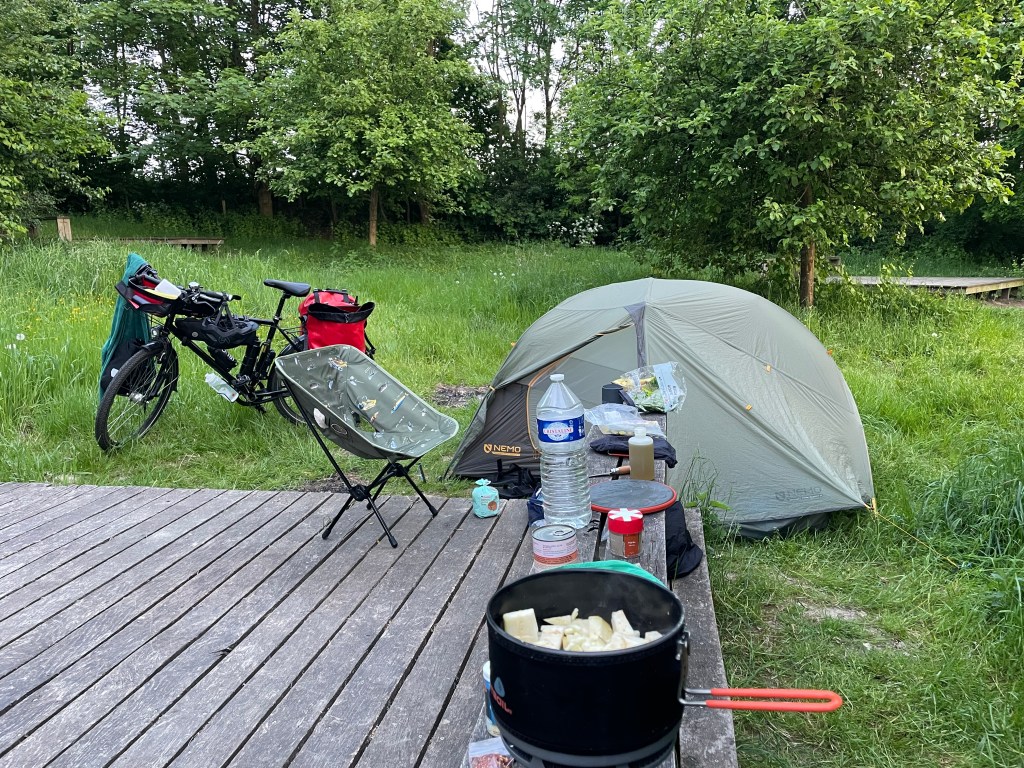 Na Hasselt wordt de route aangenamer en ik glij over een gladde F70 door het groen. Ik rij door plaatsen met namen waarvan ik nog nooit had gehoord, zoals Spalbeek en Kermt, en eindig op een legale bivakplaats tussen de Haspengouwse fruitgaarden. In mijn uitgeruste buitenkeuken bereid ik de eerste van vele spaghetti’s deze reis.