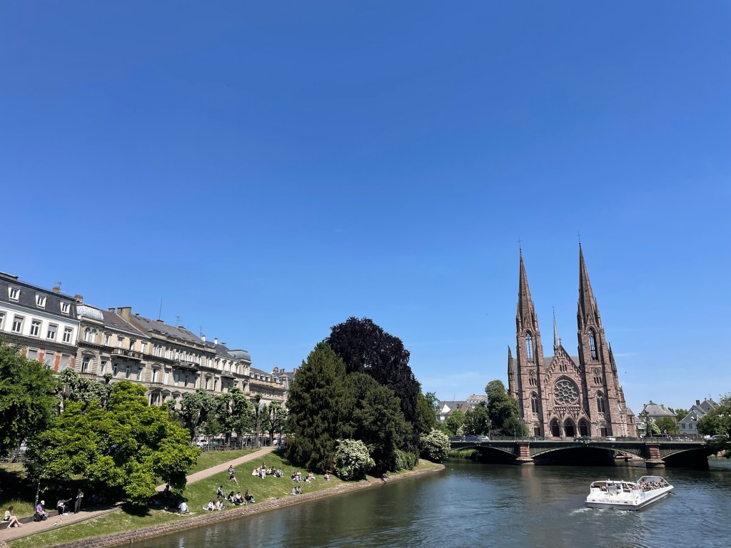 Ik bof nog maar eens met hemels weer en rij tegen een lichte, verfrissende wind over een vlakke kanaalweg richting Straatsburg. Vijf jaar geleden vormde de Europese hoofdstad het eindpunt van mijn eerste fietsreis, die ik met een goede kompaan doorstond. Doordat ik vandaag vanuit een andere windrichting binnenrijd, voelt de stad meteen heel anders aan, maar ik herken de gelaten sfeer. Straatsburg is een fijne stad en dat hebben veel andere toeristen ook ontdekt. Ik rij wat rond in het centrum, passeer kort een reisfietsenmaker met een praktische vraag en steek dan gerustgesteld de Rijn over, opnieuw Duitsland binnen. Ik hoor de lokroep van een donker bos …