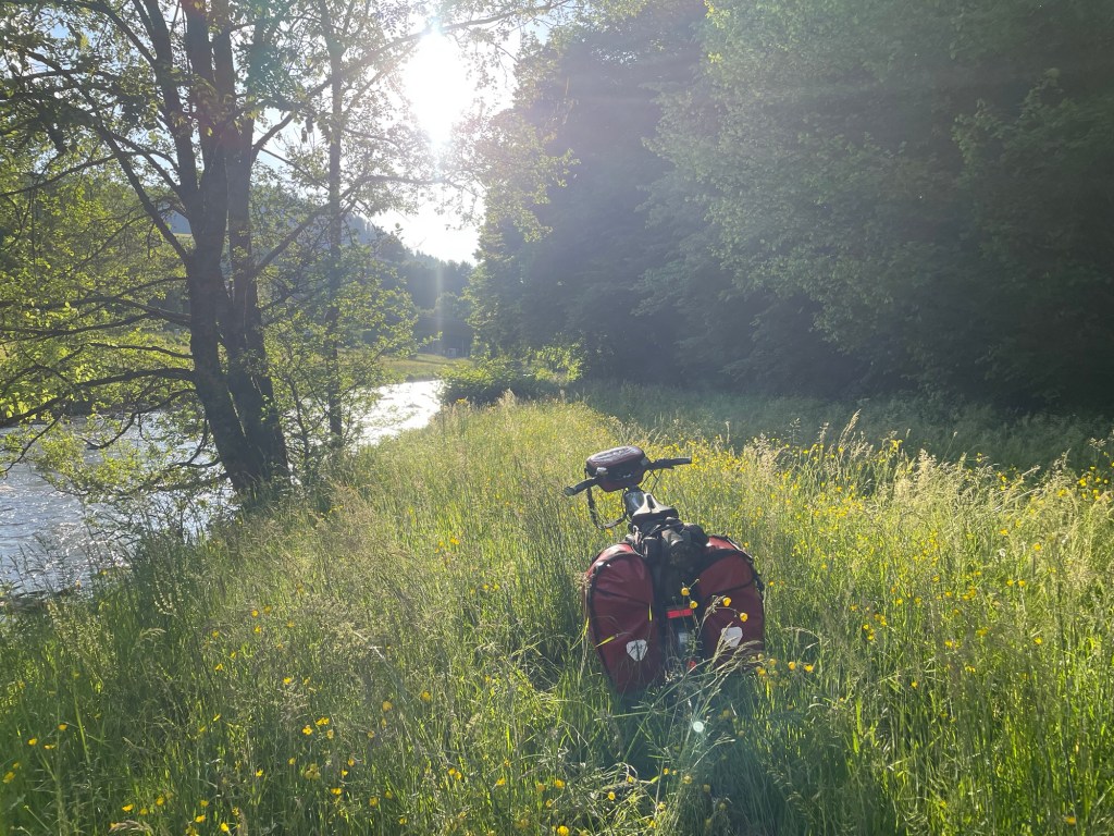 Als ik na 125 kilometer de camping bereik die ik eerst in gedachten had, beslis ik om enkel water te nemen en door te rijden. Een paar honderd meter verder vind ik langs de bebaadbare Kinzig een superplek tussen de boterbloemen. Even opfrissen in de laatste zonnestralen en nadien een Eintopf van Maultaschen (dikke Zwabische ravioli) met spinazie en oesterzwammen. Een heerlijke afsluiter van een heerlijke dag!