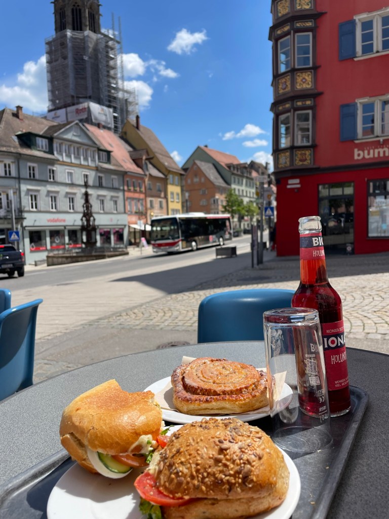In Rottweil zoek ik de zwart-bruine blafferd met de dikke kop maar de alhier herkomstige hond laat zich nergens bespeuren. Met een nieuwe dosis calorieën van de Konditorei in m’n lijf rijd ik verder door Schwaben.