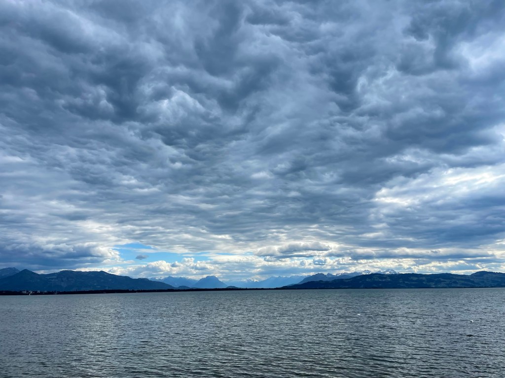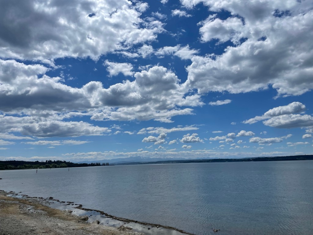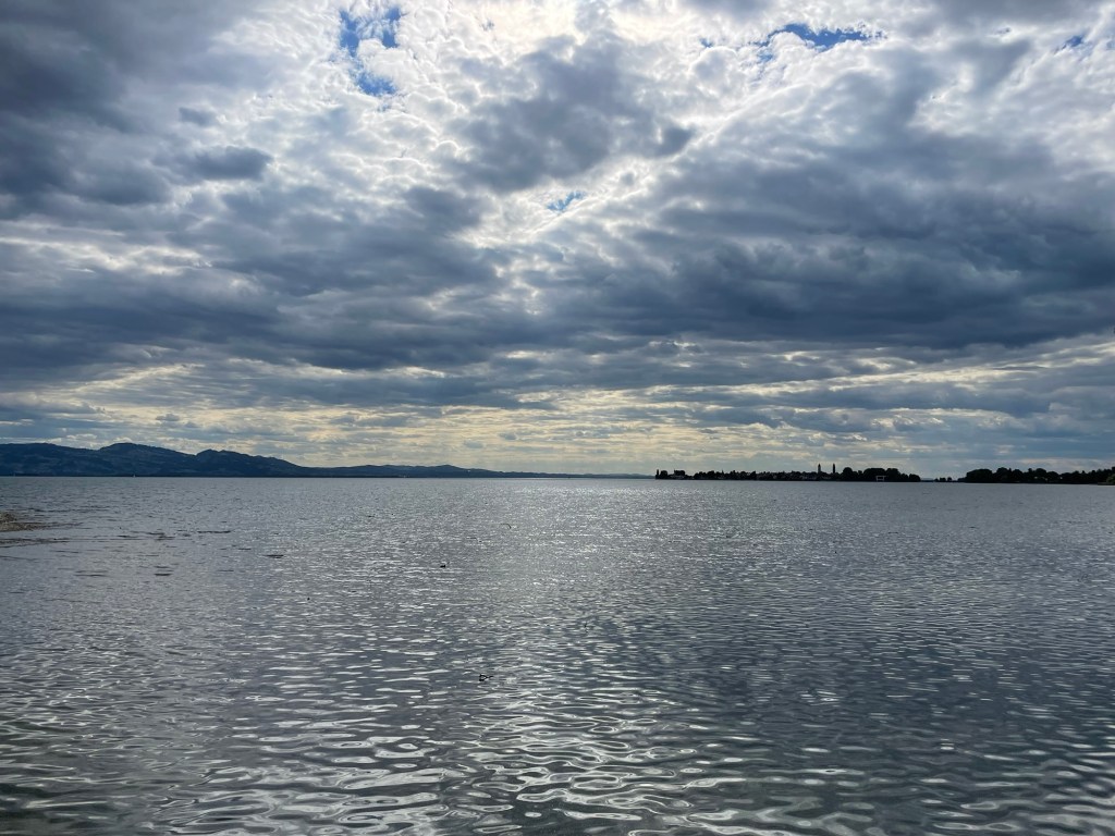 In vergelijking met de vorige 2 dagen ligt er vandaag maar een slappe etappe klaar. Er staat een frisse wind, maar de zon schijnt wederom. Helemaal aan de andere kant van het meer tonen de Alpen zich al. Door de verspreide schapenwolkjes zit het licht vandaag bijzonder goed om kiekjes te schieten.