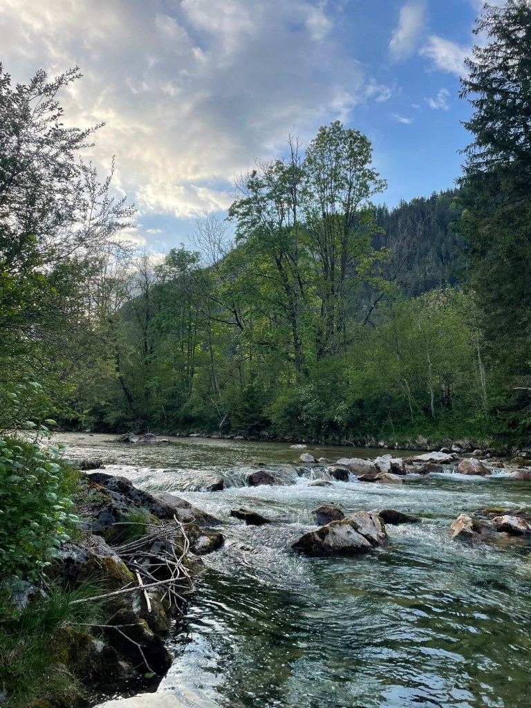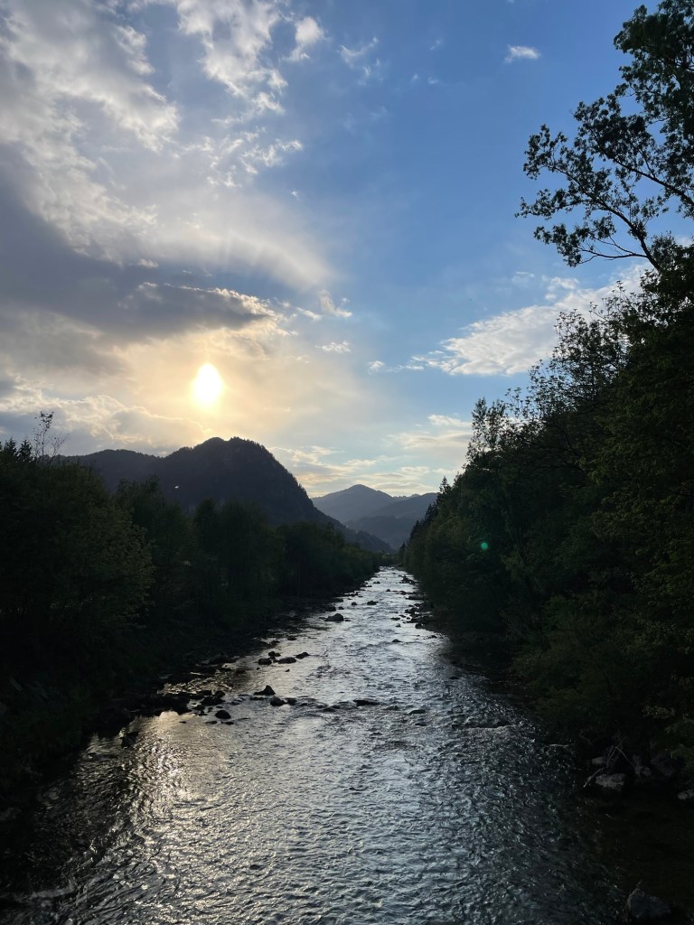 Vlak voor de grens met Oostenrijk ligt een camping, maar daar wil ik liever niet overnachten. Het is er duur en bovendien kolkt vlakbij de Vils. Ik trap er nog 8 km bij voor boodschappen en installeer mij na wat zoeken op het uiterste puntje van een doodlopend pad, ingesloten door twee rivieren, opnieuw met Oostenrijk aan de overkant. Het water is stervenskoud, maar ik overleef de verplichte wasbeurt. Ik maak snel eten en kruip vroeg in mijn tent, want er komen regenwolken aan.