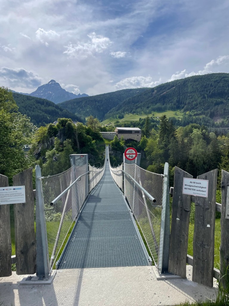 Ik word af en toe ingehaald door eBikers die wel dubbel zo oud zijn als ik. Het stemt mij hoopvol dat je tegenwoordig nog ruim boven je zestigste kan gaan bikepacken. Dankzij hen merk ik ook een grote metalen hangbrug op, waar ik op de foto ga zonder fiets. Die is natuurlijk verboden.