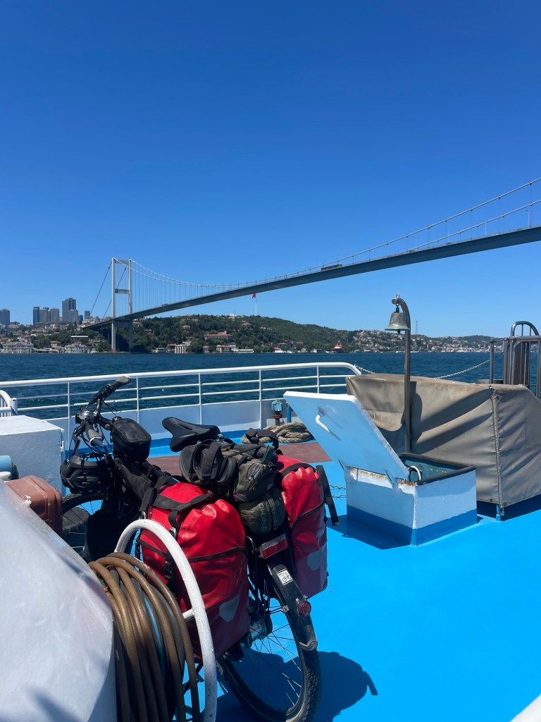 Rotsentimenteel sleep ik mijn fiets de bosporusferry op naar de buitenwijk Beykoz, om een verkeerschaos vergelijkbaar met die bij de aankomst te vermijden. Het oude continent laat ik achter en ik rol mijn banden aan wal in Klein-Azië.