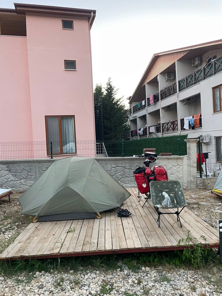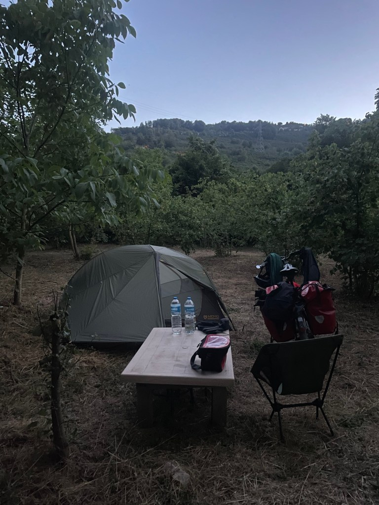 25 km moet ik tot Göllü, waar enkele campings liggen. Mijn research trekt op niks, het zijn stacaravanparken en ze laten me niet binnen achter hun prachtige hoge hekken met scheermesdraad. 8 km verder vind ik aan de Zwarte Zee een kamp waar de bewoners voor nog een hele tijd lijken neergestreken. De commune leeft in woonwagens, tenten en achter zonneschermen en ik voel me er niet helemaal welkom of op mijn gemak. Na nog veel zoeken neem ik genoegen met een vieze picknickplek, weg van wasgelegenheid maar wel met zicht op een zonsondergang als een raketijsje.