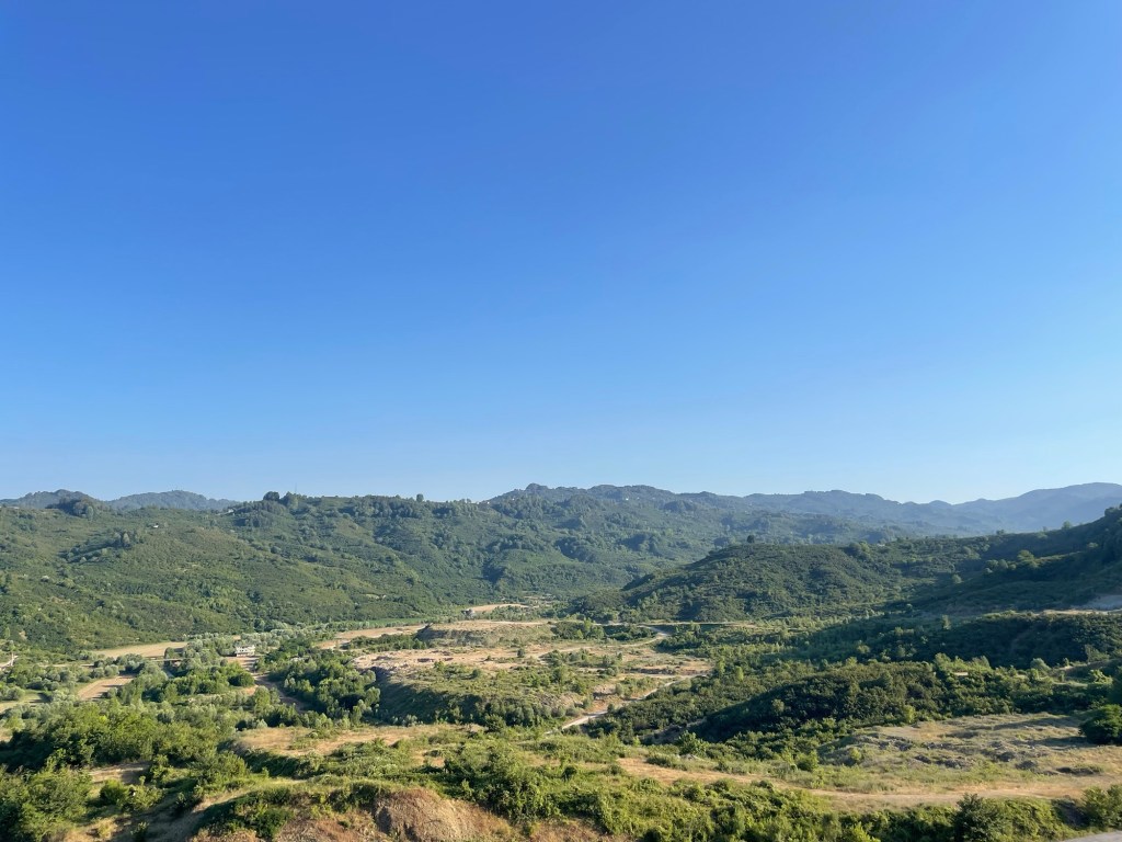 Op de top prijkt een kleine, turkooizen moskee in de weg van een foto van het totale uitzicht. Dan kom ik voor een splitsing te staan. Links kan ik 2,5 km steil afdalen naar een potentiële kampeerplek, zonder enige garantie. Rechts is het evenveel afdalen tot een camping aan dezelfde rivier. Als het links niks wordt, moet ik weer omhoog, dus het wordt rechts. Net voor de camping vind ik toch nog een pad dat afwijkt langs de rivier en daarnaast een vredige, schaduwrijke plek tussen de hazelaars. Oef, juist gekozen!