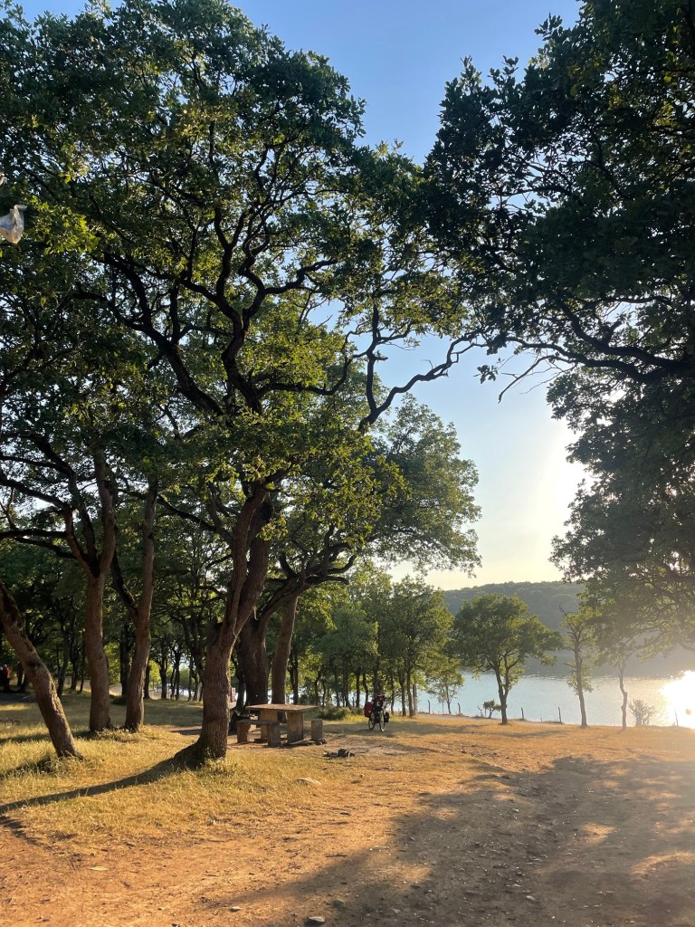 In het schemerlicht ga ik net buiten de stad op zoek naar een plek langs een rivierbedding. De stroom is helemaal opgedroogd, maar de truc met de douchezak bewijst zijn nut wederom. De zwerfhonden willen eerst niet weten van mijn aanwezigheid, maar de plek onder die honderdjarige eik is te mooi om te laten liggen, dus ik blijf.