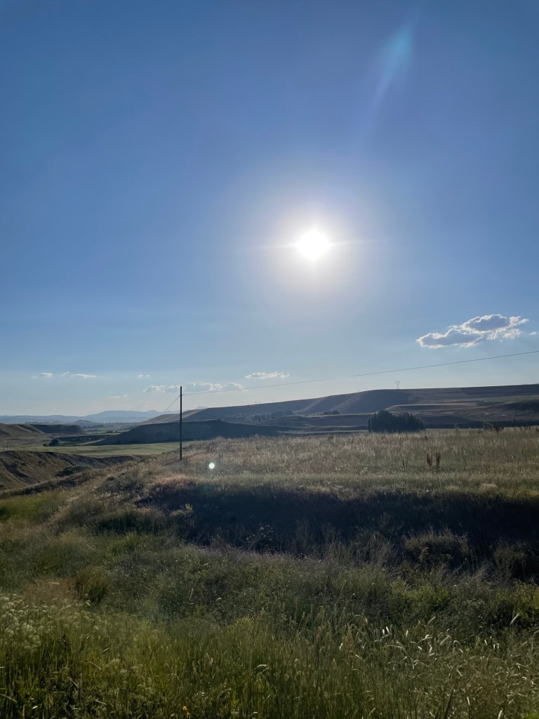 Het landschap is bevreemdend doordat het overal slechts heuvelachtig oogt, door graan en groen. Als ik het niet wist, zou ik nooit raden dat ik op zulke hoogte zit. Bij 2000 m denk ik aan scherpe pieken en ontussendoorfietsbare almen. Verderop loopt de baan hoog over de bergstompen, zonder al te veel op-en-neergewip, als de kromgetrokken nok van een verzakte boerenschuur.