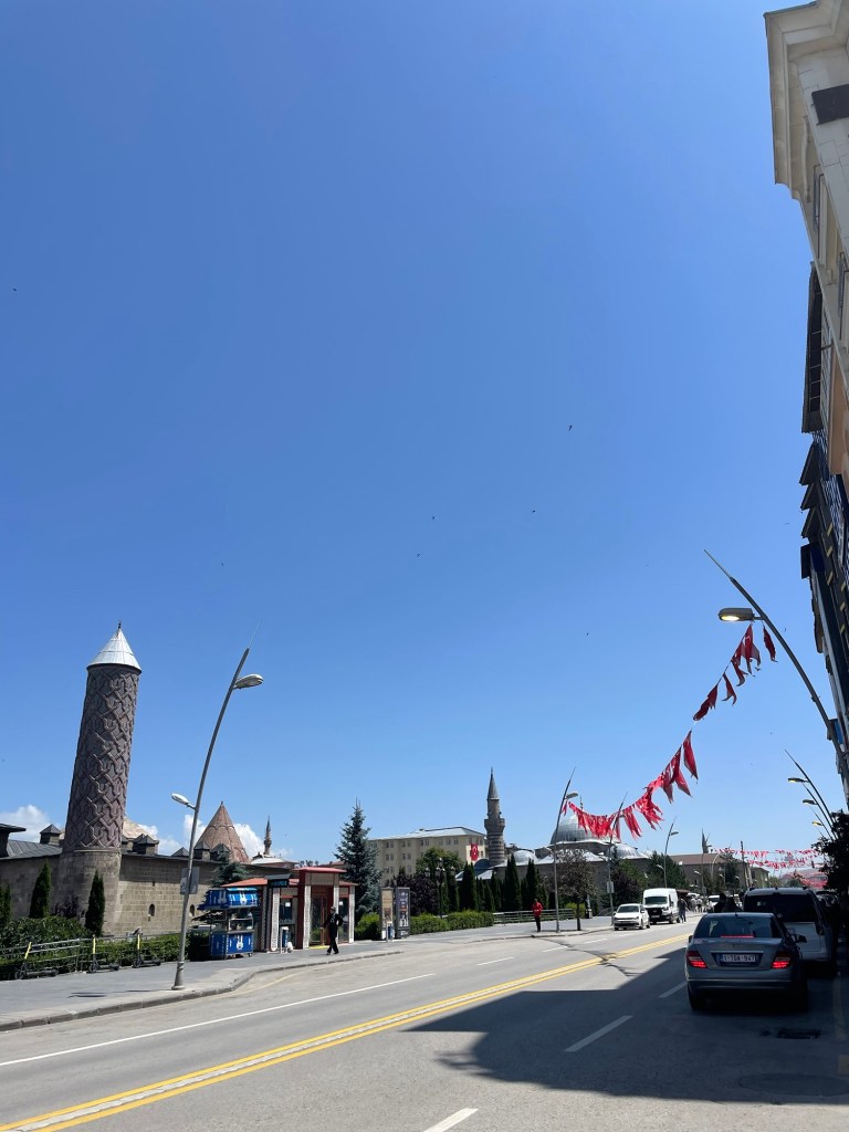 De hoofdstraat van Erzurum voorziet in een snelle passage bij alle bezienswaardigheden. Een malheureuze bastaard van een straathond, schijnbaar kind van een herder en een dachshund, tracht met zijn korte pootjes vergeefs een dikke kluif te pikken uit een laadbak bomvol knoken. Chauffeurs lijken hier gejaagder dan elders in het land. Eén automobilist snijdt me gefrustreerd de pas af, waarop ik scheld en hij antwoordt met een lange, boze toeter. Een andere chauffeur geeft me door zijn raampje in het Duits gelijk en waarschuwt dat het hier oppassen is.