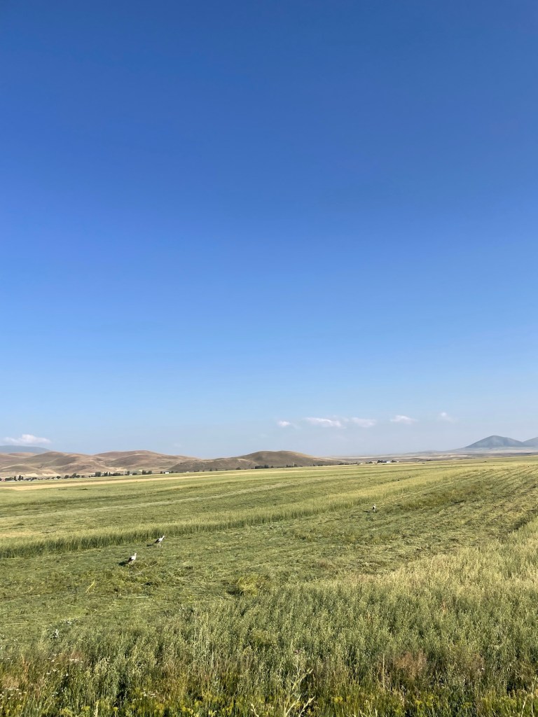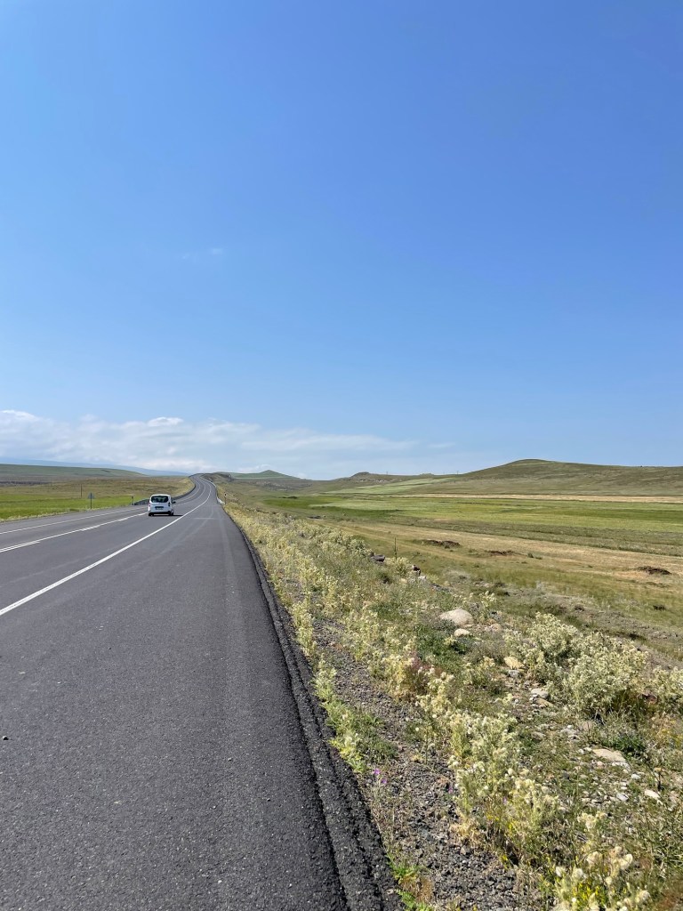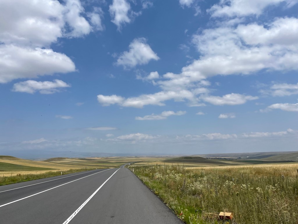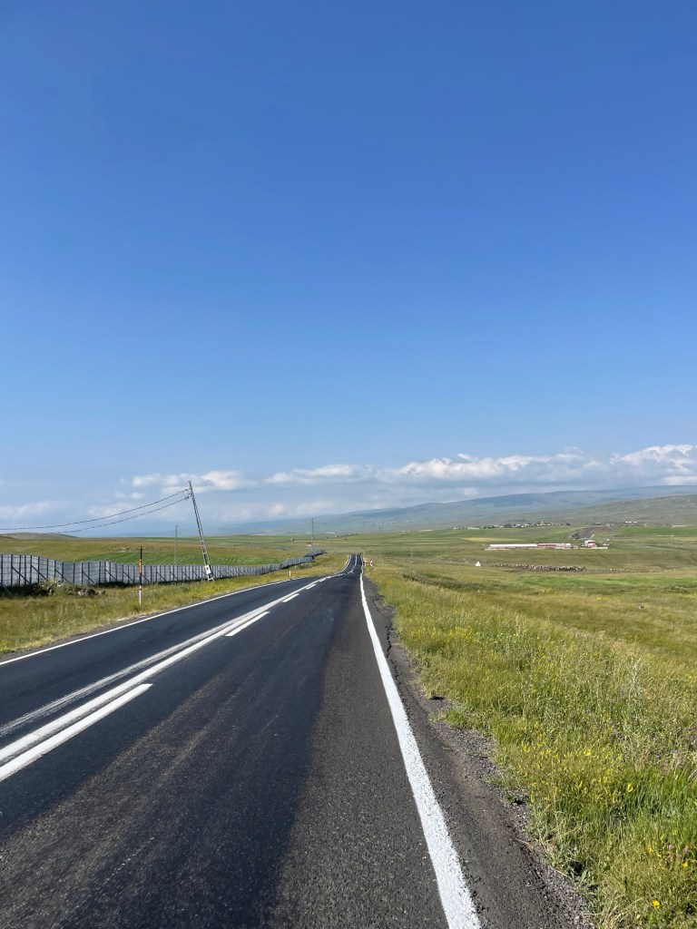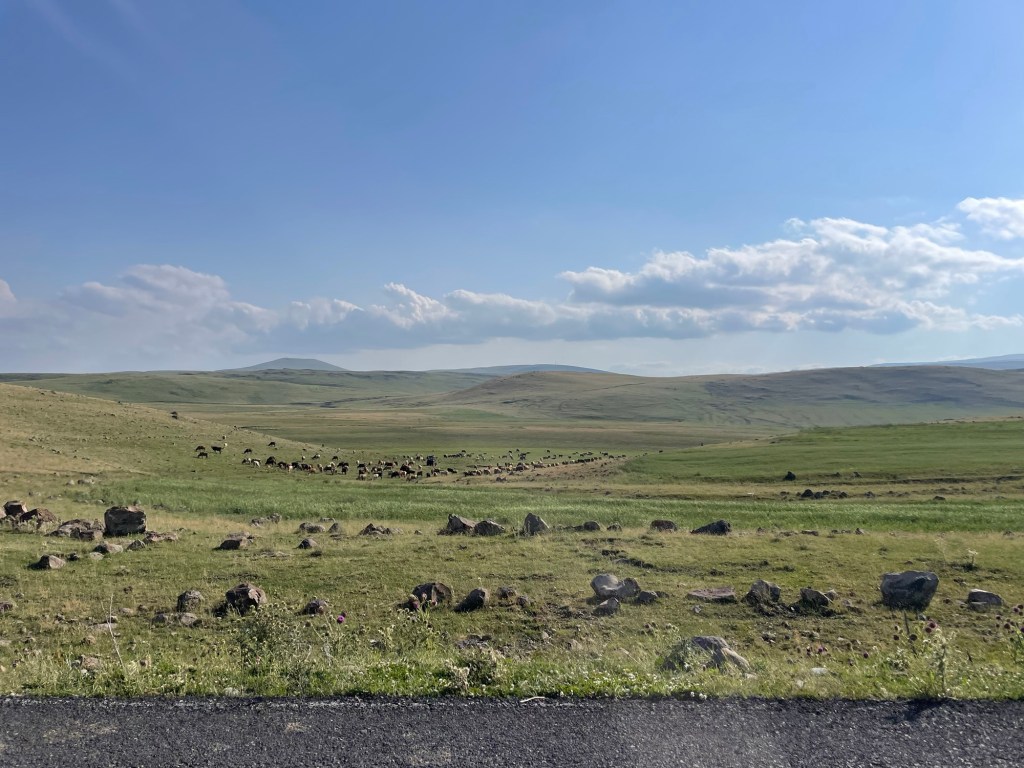 Zonder dat ik er veel erg in had, is het landschap overgegaan in een meesterwerk. Een stuk om via een grotere baan klim ik toch nog een heuvel op en rij dan door onmetelijke velden in wel duizend tinten groen. Het moest vannamiddag enkel bergaf lopen, maar daar merk ik weinig van. De tegenwind blaast ongenadig, zodat ik moet bijtrappen om boven de 20 uit te komen. Van daar doemen de buitenwijken van Kars al op.