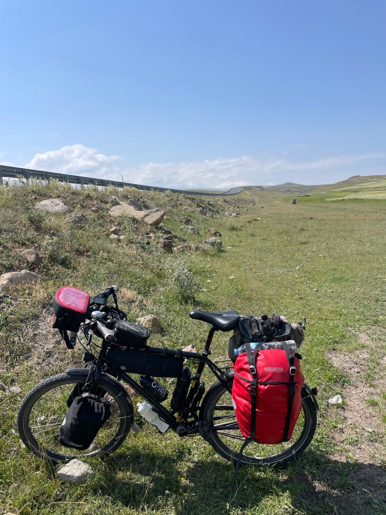 Vanuit een veld naast de weg is te zien hoe die onmogelijk door het landschap zwenkt. De vélo dient dwars opgesteld als paravent. Door de aardkorst lopen langgerekte scheuren, evenwijdig met de schijnbaar door mensenhanden aangelegde bergkam tussen groene stompe toppen. Te midden die scène stomp ik gedachteloos verder. Het is zielloos, plichtsbewust gepedaal, als op een aftandse hometrainer zonder kilometriek. Maar goed, fietsen is fietsen, en de steppe moet nog komen.