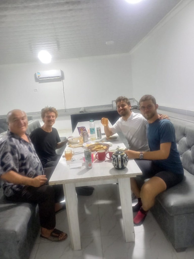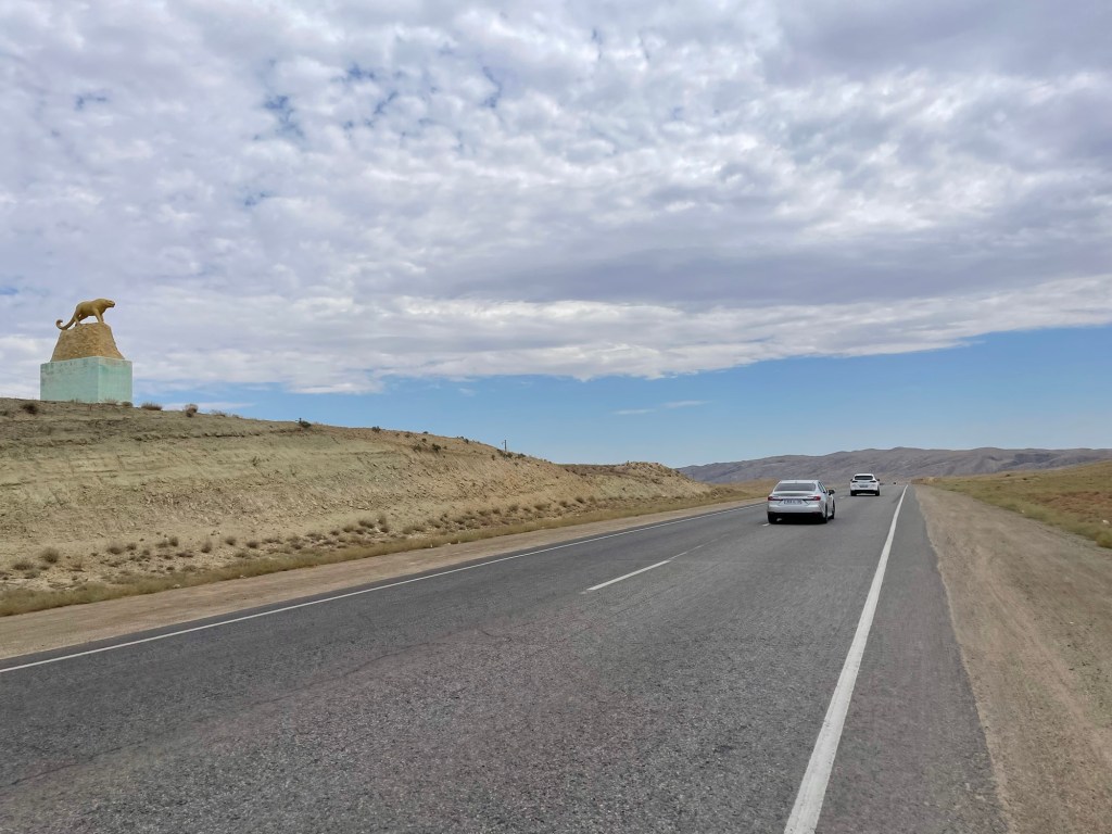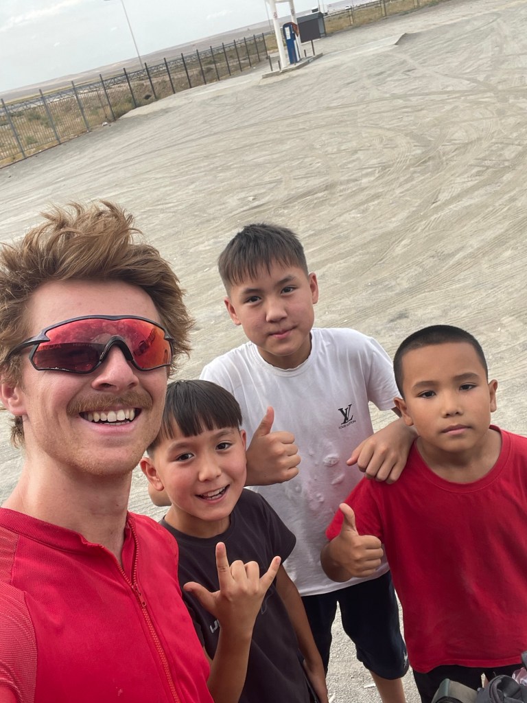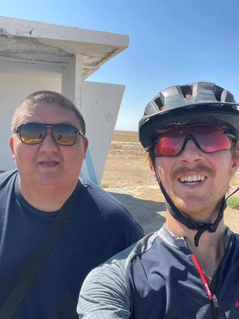 Uit een auto springen de enthousiaste Muhammad en twee van zijn familieleden, waarmee ik absoluut op de foto moet. Hij vraagt of ik iets kan gebruiken: water, cola of zelfs gewoon geld. Als hij vraagt naar het aantal reisdagen, hoor ik hoe hij 95 vertaalt als ‘toksan biesj’. Dat lijkt verdacht veel op het Turkse doksan beş …