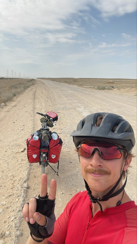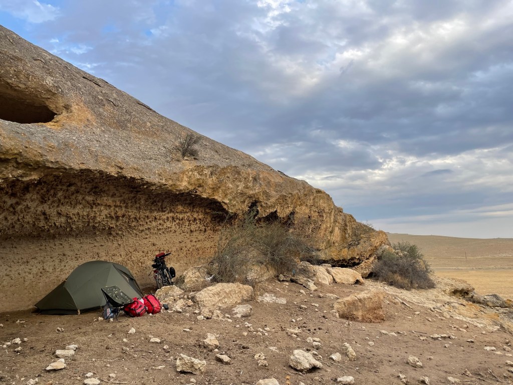 Nog nooit was mijn fiets zo zwaar beladen als vandaag. Sinds ik uit Tbilisi weg moest vliegen, weet ik dat hij en alle bagage samen bijna 45 kg wegen. Daar komt nu nog zo’n 5 kg aan houdbare voeding bij en 10 kg aan water.