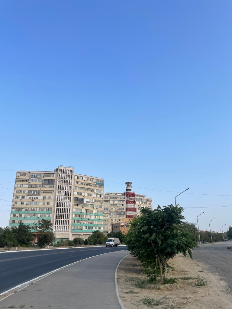 Ik ontwaak op een bed, harder dan een soldatenbrits, in de karaokekelder van een voormalige nachtclub. Ik bevind me plots in Aqtau, een stad aan de Kaspische zee waar, los van de zandsteenrotsen aan het water, weinig fraais te bewonderen valt. Het eeuwige gelige licht maakt de brutalistische blokken wel erg beeldgeniek.