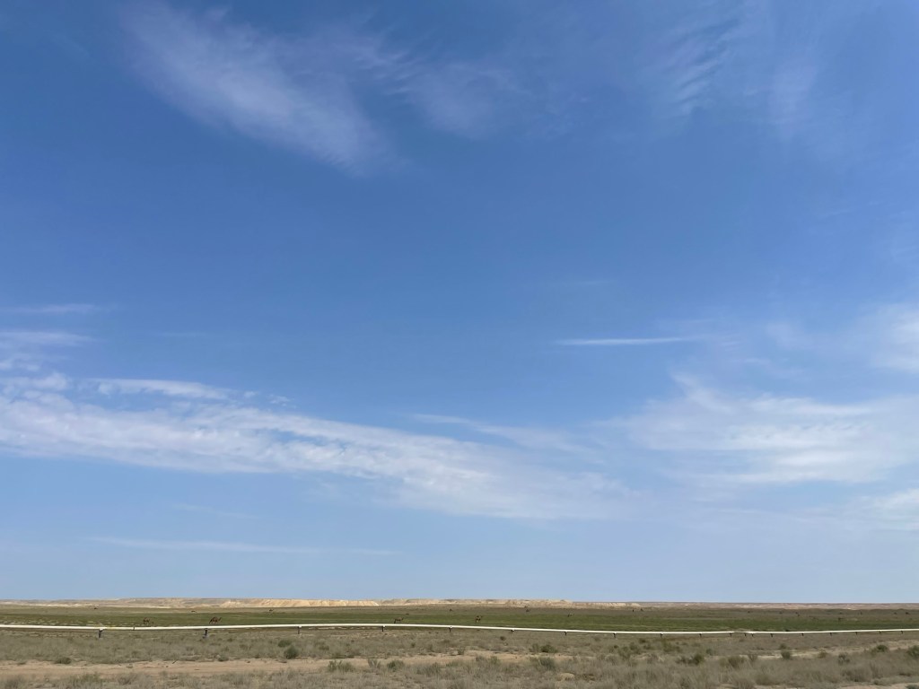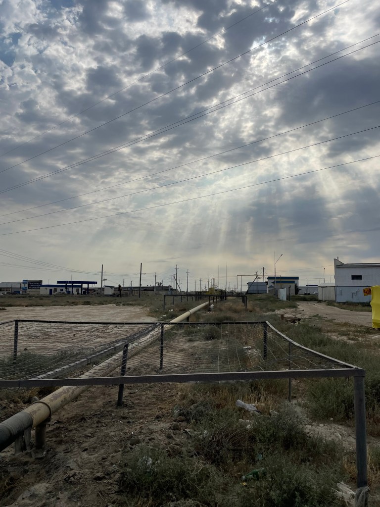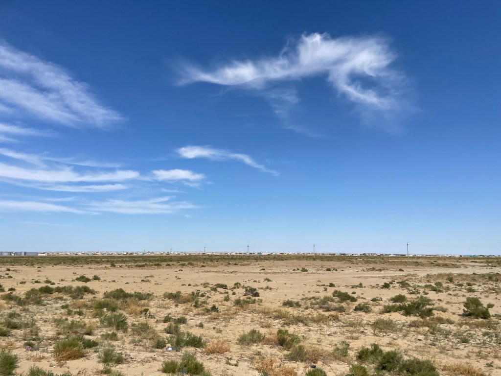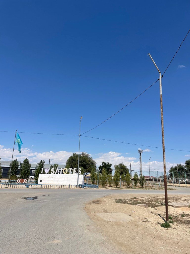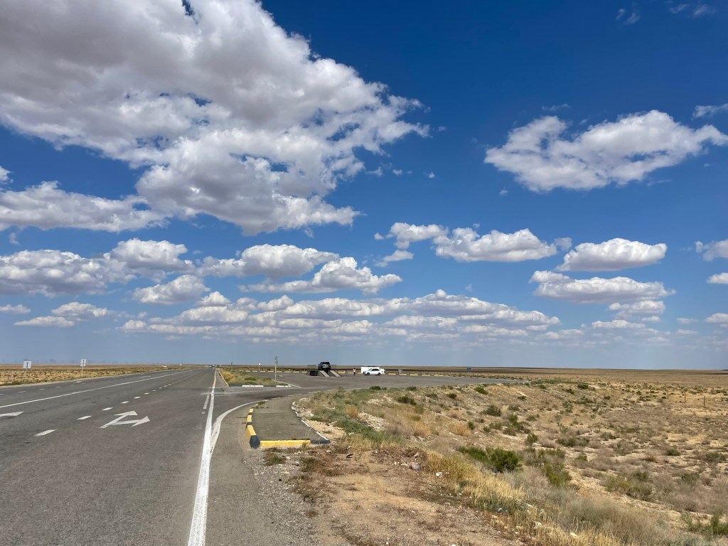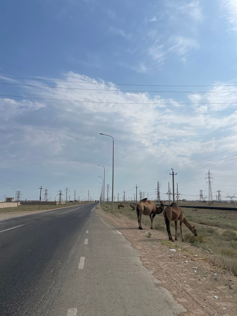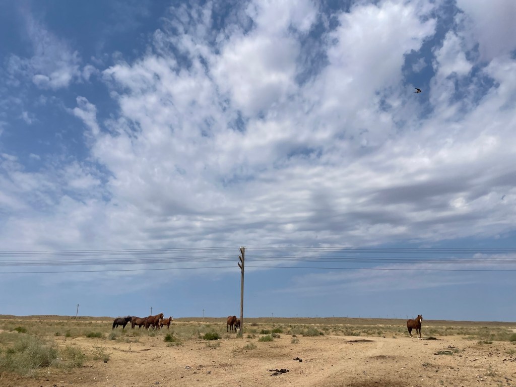 Voor de gelegenheid ben ik voor dag en dauw opgestaan maar omdat er nog wat praktische zaken in orde moesten en de fiets anders opgeladen, fiets ik pas na 9 uur weg vantussen de Aqtause blokken. Het heeft iets bevreemdends, weten dat je het zicht op de betonnen kolossen zo meteen inruilt voor de leegte. De zon prikt het wolkendek lek en komt alvast een keertje piepen.