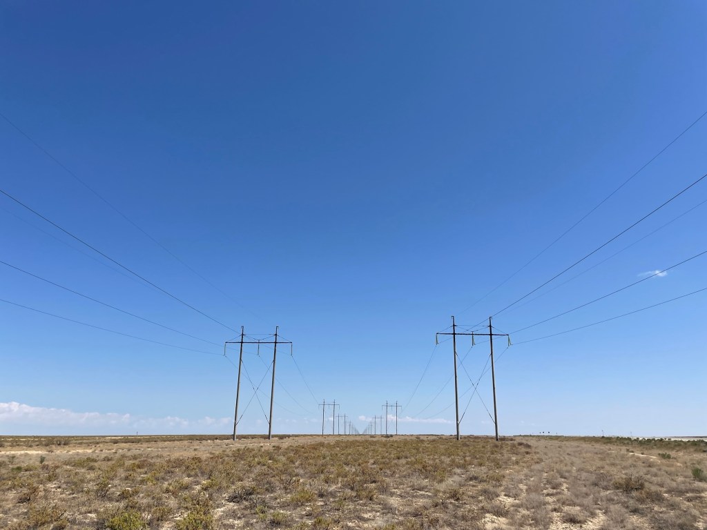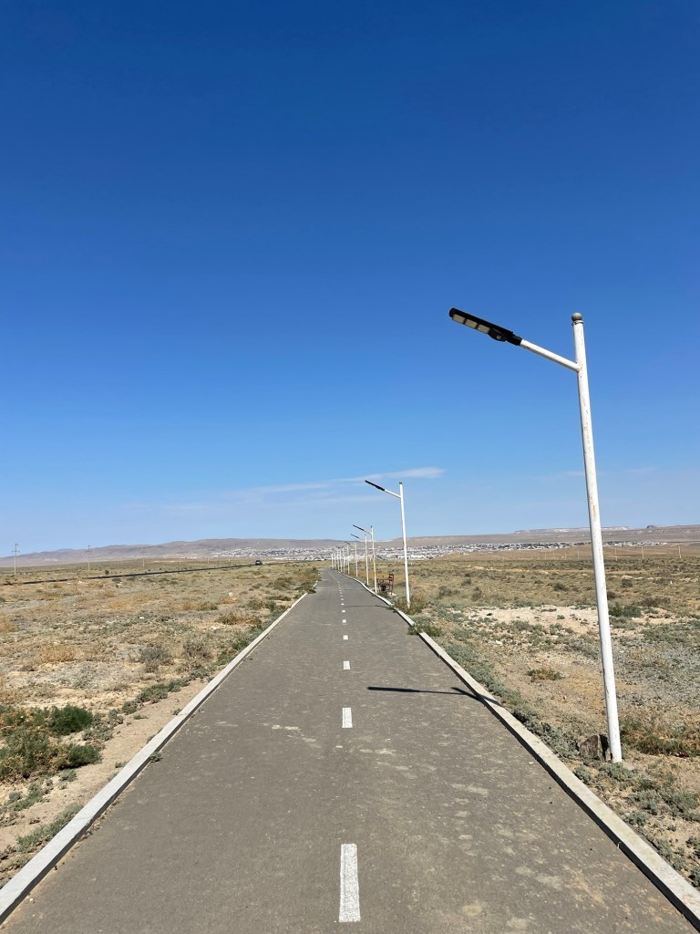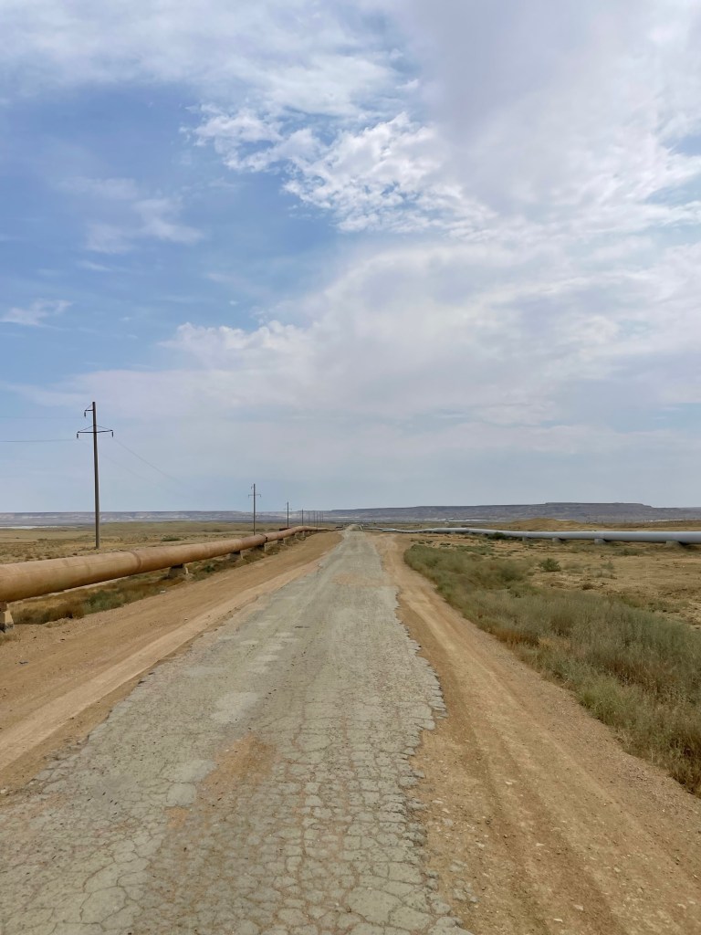 Er ligt helemaal niets meer in zicht, afgezien van het asfalt voor en achter mij en rechts wat lijkt op een oude telegraaflijn. In de juiste invalshoek ziet de baan eruit als een lange, smalle spiegel of een siervijver gevuld met kwik. Als de kabels de baan oversteken, pauzeer ik in de schaduw van de palen voor een krachtreep en een cocktail van water, citroensiroop en een hydraterend poeder dat ze me in de Aqtause apotheek aanbevalen. Het symmetrische beeld van de lijnen die in het vluchtpunt verdwijnen, had ik al op meerdere blogs zien passeren, dus ik wandel een stuk de kant in voor mijn eigen versie van het plaatje.