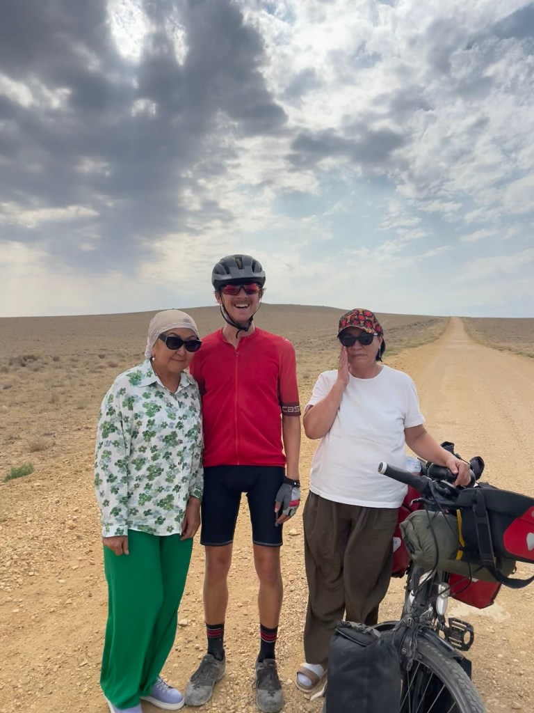 Op 12 km ligt al de afslag naar een winkel, maar het is 10 km heen en terug. In mijn flessen zit ongeveer 3,5 liter water. Tot de stad Beyneu was het 100 km. Meer dan 20 per uur trappen moet lukken vandaag. Cijfertjes dansen door mijn geest. Ik beslis het erop te wagen. Als ik van de dorst neerzijg, drenkt een van de hartelijke Kazachen me vast wel. In de schaduw van een bushok ontmoet ik er al een die bovengemiddeld Engels spreekt. Als ik doorrijd, stopt hij me zomaar 4000 tenge toe. Mijn Vlaamsheid weigert het aanbod stellig maar zijn Kazachse hulpdrang is vele malen sterker. Hij wil dat ik er iets te eten mee koop.