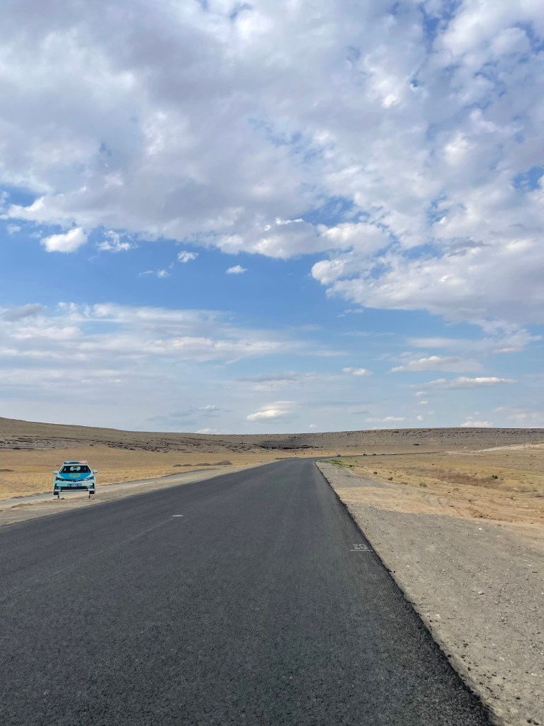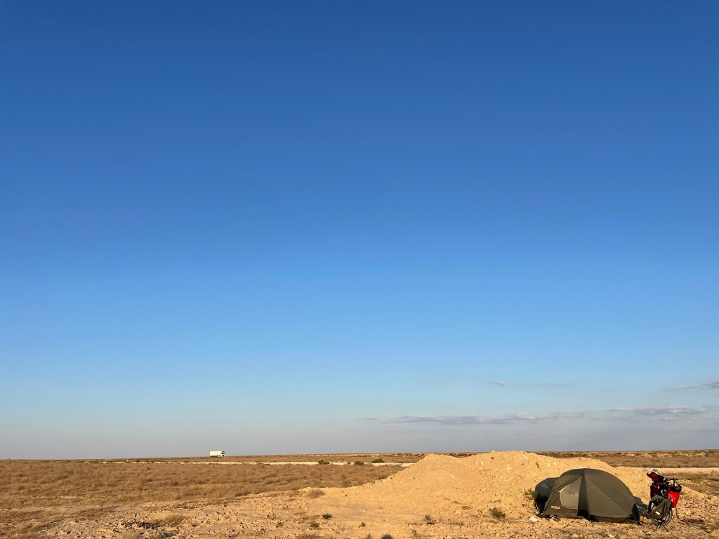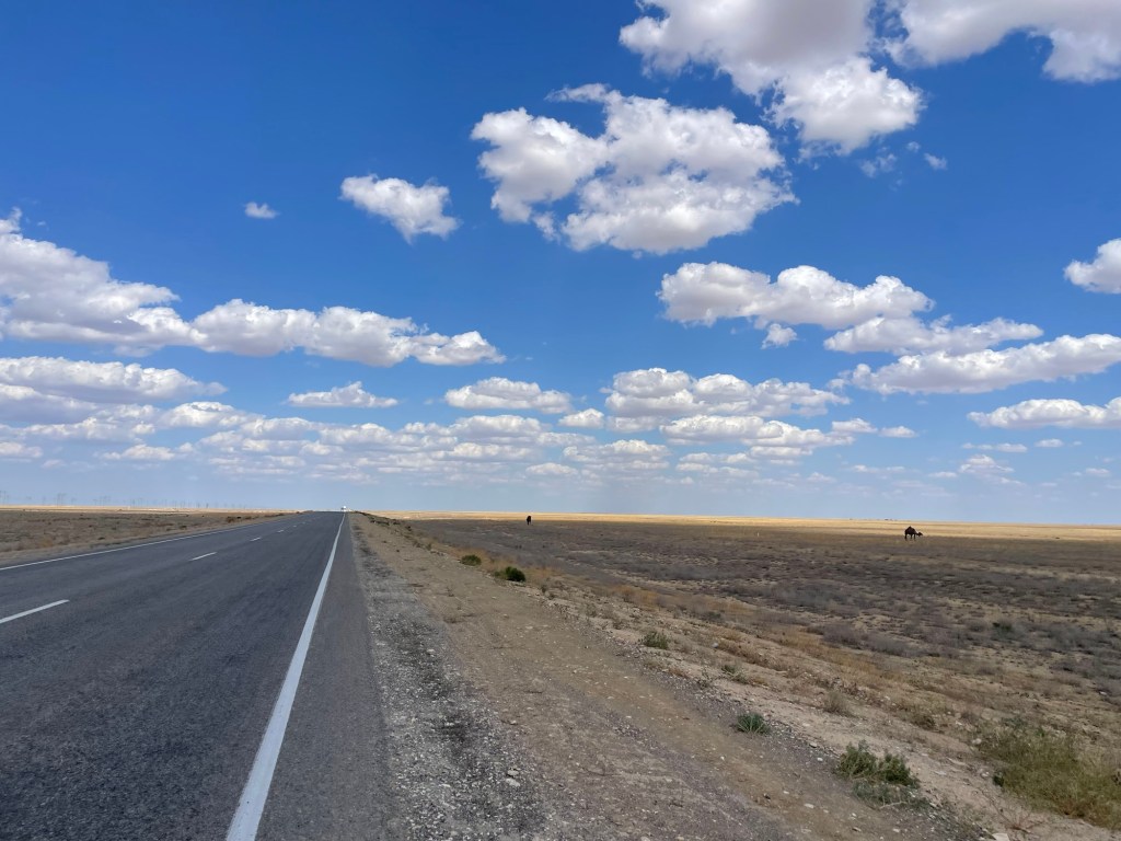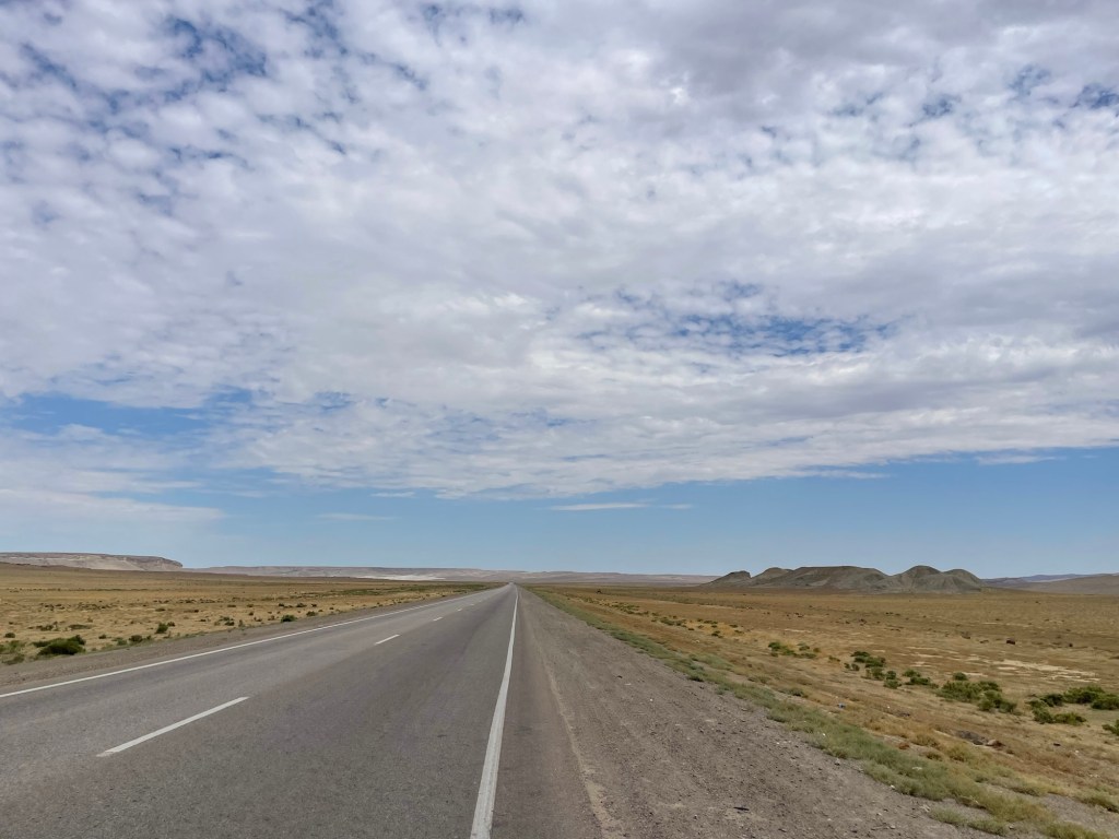 Terwijl ik nog een halve dag te gaan heb tot de stad, blik ik al terug op een magnifieke tijd in Mangistau. Het is vreemd dat veel voorgangers adviseren om dit deel over te slaan per trein. Voor mij is het het toverachtigste en meest begeesterende stuk van de reis tot nog toe. Er zijn wel hele stukken waar weinig te bewonderen valt, waar de baan een oneindigheid rechtdoor loopt tot de horizont, maar dat heeft ook zijn voordelen. Je kan eindelijk een keer in gedachten verzinken zonder dat je moet opletten voor afslagen, angstaanjagend verkeer of andere gekke dingen. Het is wegdromen en kilometers malen en het is genieten. Al hoort daarbij wel de kanttekening dat ik onwaarschijnlijk veel geluk heb met weer en wind op deze vierdaagse. In andere omstandigheden zal het hier de hel zijn.