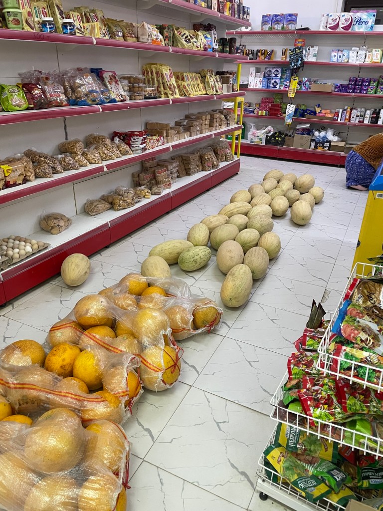 Onder een schaduwtent verkoopt een vriendelijke, eenogige man drie soorten meloenen. ‘Heb je water?’, vraag ik in het Turks. ‘Dat heb ik’ antwoordt hij, orenschijnlijk ook in het Turks. Kazachs is een Turkse taal en vooralsnog had ik er nog niet heel veel succes mee, maar om iets zo vitaal als water te vragen werkt het gelukkig dus wel.