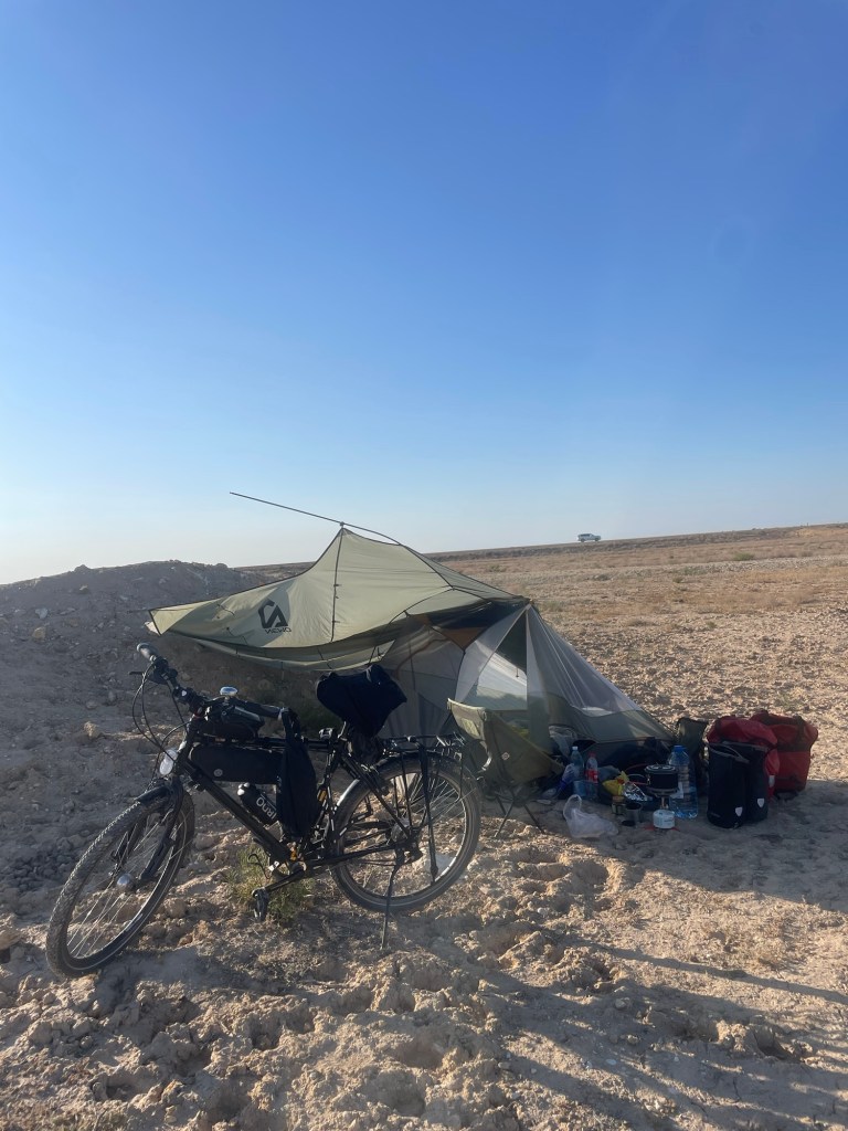 De heuvel van grond biedt schaduw tot 7 uur precies. De buitentent span ik van het tentdak naar de bergtop om een shelter op te zetten. Het hoeft eigenlijk niet. ‘s Ochtends is het verrassend fris in de woestijn.