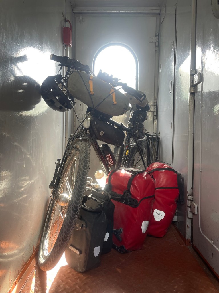In de gang waar mijn fiets staat, zet ik mijn eigen stoel op, in de sigaretten- en wc-lucht en het ijzeren treingebulder, terwijl ik geen seconde alleen gelaten wordt door geïnteresseerde reizigers. De 13 conducteurs zien er geen graten in dat ik half in de doorgang zit, maar een fiets die een centimeter verkeerd staat, ho maar.