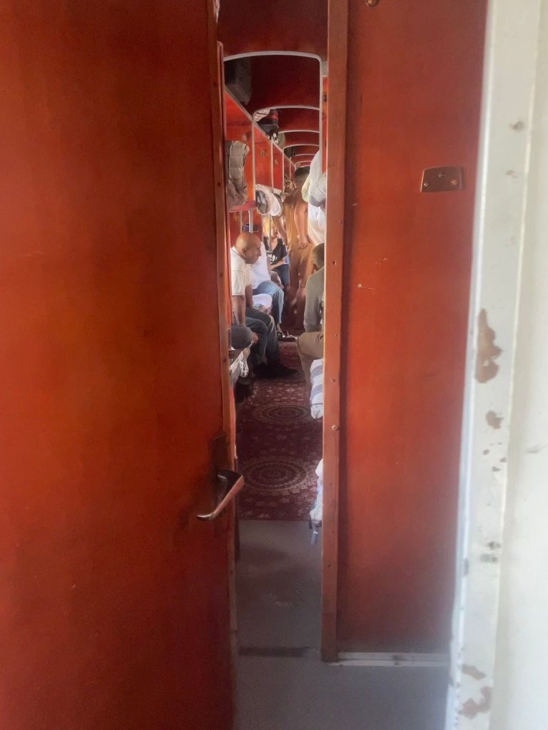 Dan moeten we nog met onze zweetkop op de foto, gezeten op een treinbankje, tussen houtwerk en tapijten. Na vertrek verdwijnt ons paspoort alweer voor een halfuur voor de zoveelste controle. Intussen maak ik me er al geen zorgen meer om, het komt wel terug. De aandacht voor de turist is veel groter dan voor alle Kazachen, Oezbeken en Tadzjieken die richting Doesjanbe sporen.