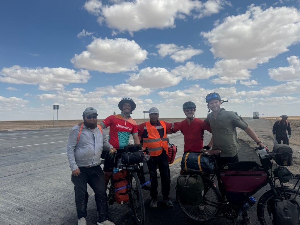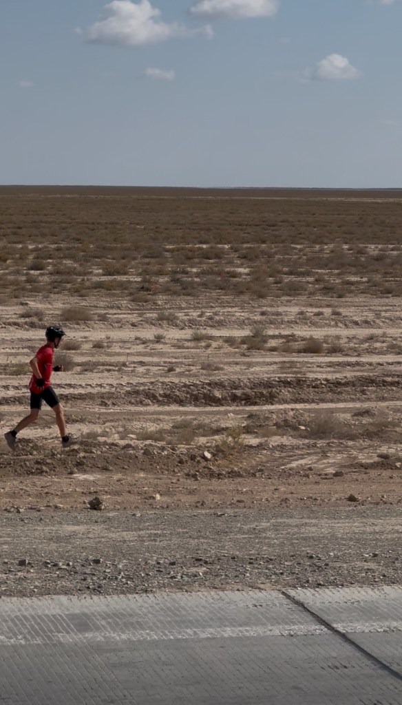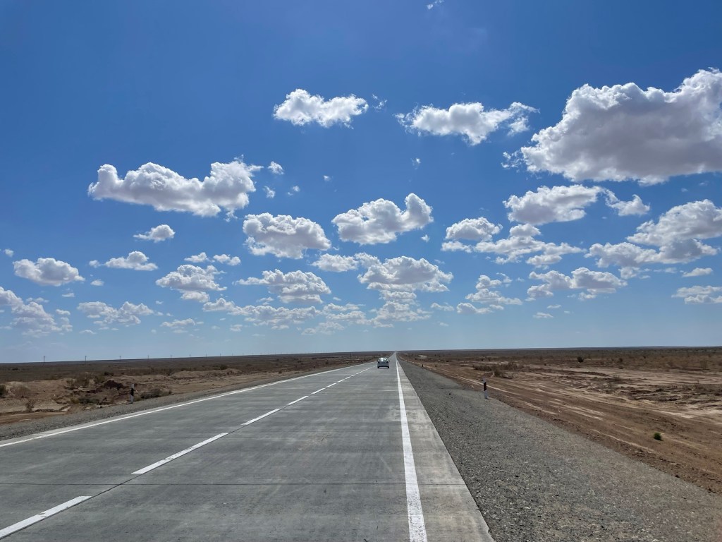 In de verte liggen de restanten van wat ooit een meer moet zijn geweest. Vanaf de baan is het moeilijk te zien, maar er lijkt enkel een zoutvlakte overgebleven tussen steile wanden. Wellicht is het door mensenhanden drooggelegd voor industrie of katoenbouw, net als het ooit zo imposante Aralmeer. Voor even probeer ik de oude baan, die hier naast de nieuwe loopt, content dat ik vandaag een effener pad kan berijden. Nadat ik met een grote ommezwaai de bocht om het voormalige meer volmaak, gaat het terug tegen de 30 op een lichte rugwind. Vanuit een samengeperst Damas-busje roept een oudere man ‘Helloooo, hoooow aaarrreee youuuu?!’. De Karakalpaken zijn al net zo bemoedigend als de Kazachen.