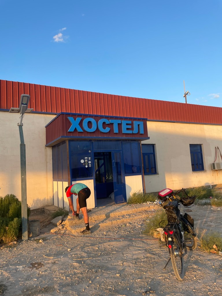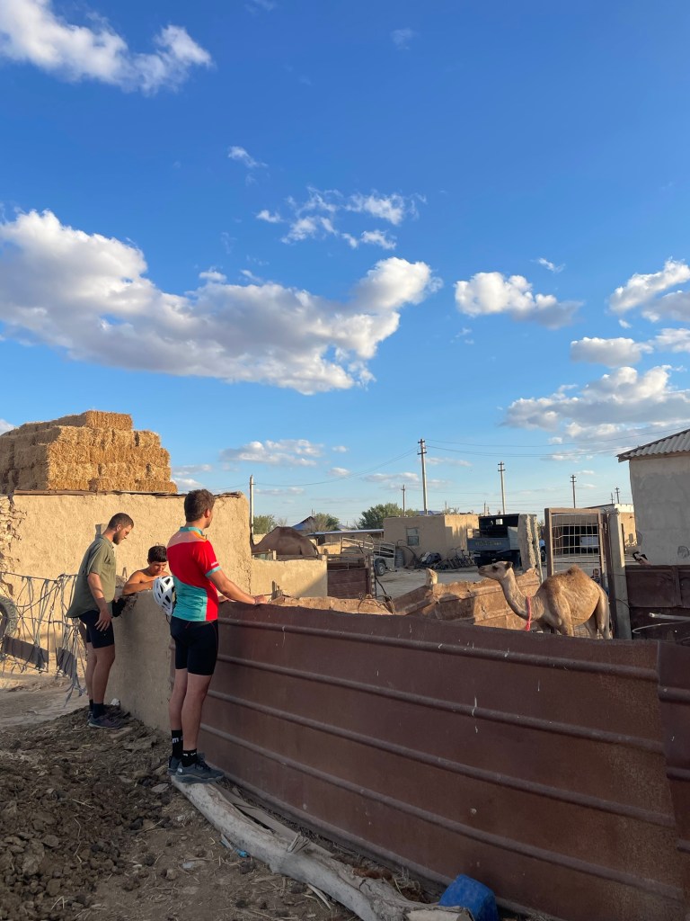 Na nog geen 5 uur zadeltijd zitten de 140 kilometers erop. We botsen Jasliq binnen over een betonnenplatenweg, vreten ijs en druiven en zetten ons op het eerste terras voorbij de Kaspische Zee. Salade en brood zijn mijn enige optie, de kets krijgen samsa’s, ovengebakken deegwaren gevuld met aardappelen en vlees. We houden nog een fotoshoot met twee poserende dromedarissen en een afgezonderd kalf en rijden naar het enige hostel, dat meer wegheeft van een lamentabel motel. Ze willen eerst 45 Amerikaanse dollar, een gegeerde munt, maar daarop kan Henry binnen enkele seconden afdingen tot 20, zo maar even 245000 Oezbeekse sum.
