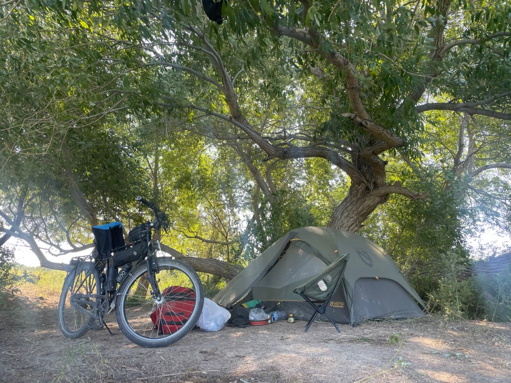 Voorbij Gurlan wil ik enkel nog zo snel mogelijk een bivakplek vinden en met rust gelaten worden. Een scooterrijder komt wat tegen me wauwelen en als ik stop om de weg te vinden, neemt hij zonder vragen al selfies met zijn kleinkind en mij er bij op. Langs de oever kan ik tussen de rijstvelden maar geen afgezonderde plek vinden. Elke keer staat er al een auto geparkeerd. Aan de bomen hangt een wit soort pluis dat in een nauwe doorgang wel een winterwonderland lijkt te scheppen. Na veel te lang zoeken zet ik me in het laatste licht dan toch maar naast een auto op de beenharde bodem.