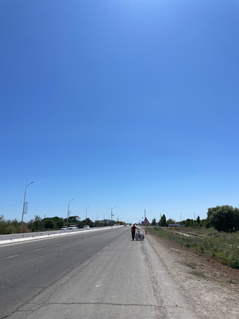 Terwijl ik in de schaduw van een bushalte brood met pikante adzjika besmeer, stopt er een marsjroetka, een van die smalle Daewoo Damas-busjes, die dienen als openbaar vervoer. De chauffeur wil me resoluut een fles water schenken maar omdat ik al genoeg kilo’s voortduw, weiger ik. Na vijf keer proberen geeft hij pas op.