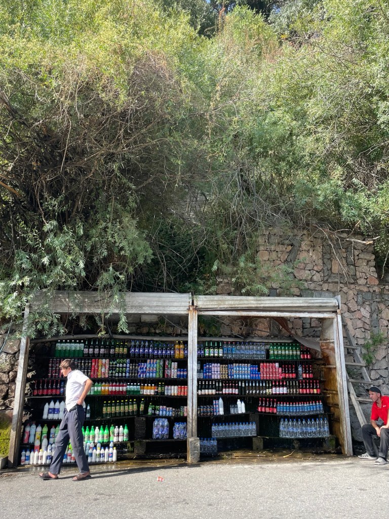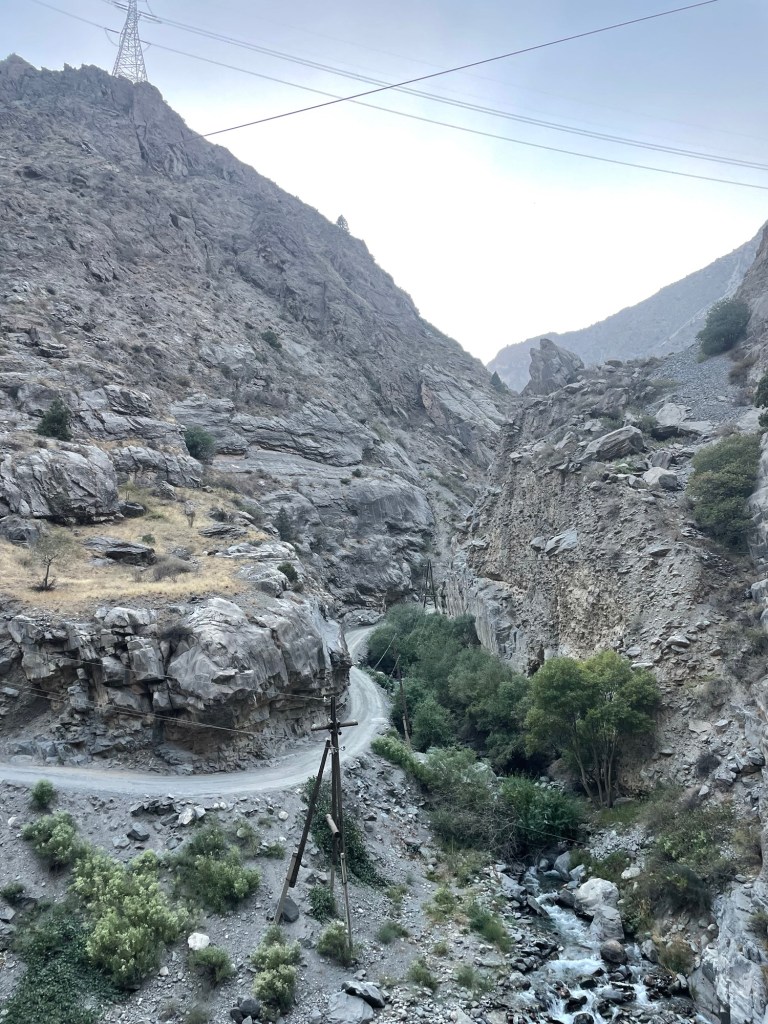 Na de boodschappen in de pure dorpse chaos van een winkeltje, kijk ik uit naar een kampeerplek, al wordt het landschap nu wel erg kaal. Waar twee rivieren ineenvloeien, sla ik een nieuwe vallei in, nog steiler en nog hoger en nu met een blauwe, vloeiende veroorzaker van dat alles in de diepte. In de smalle kloof is er naast de baan nergens ruimte, enkel nog afgrond. Als het tijd wordt om te stoppen, kan ik enkel blijven doorgaan en hopen dat er om de volgende bocht wél iets staat van bomen of beschutting.