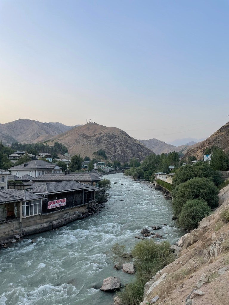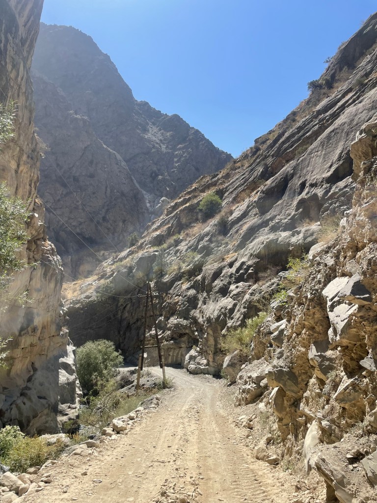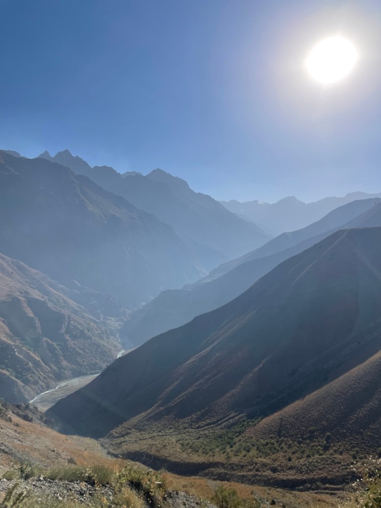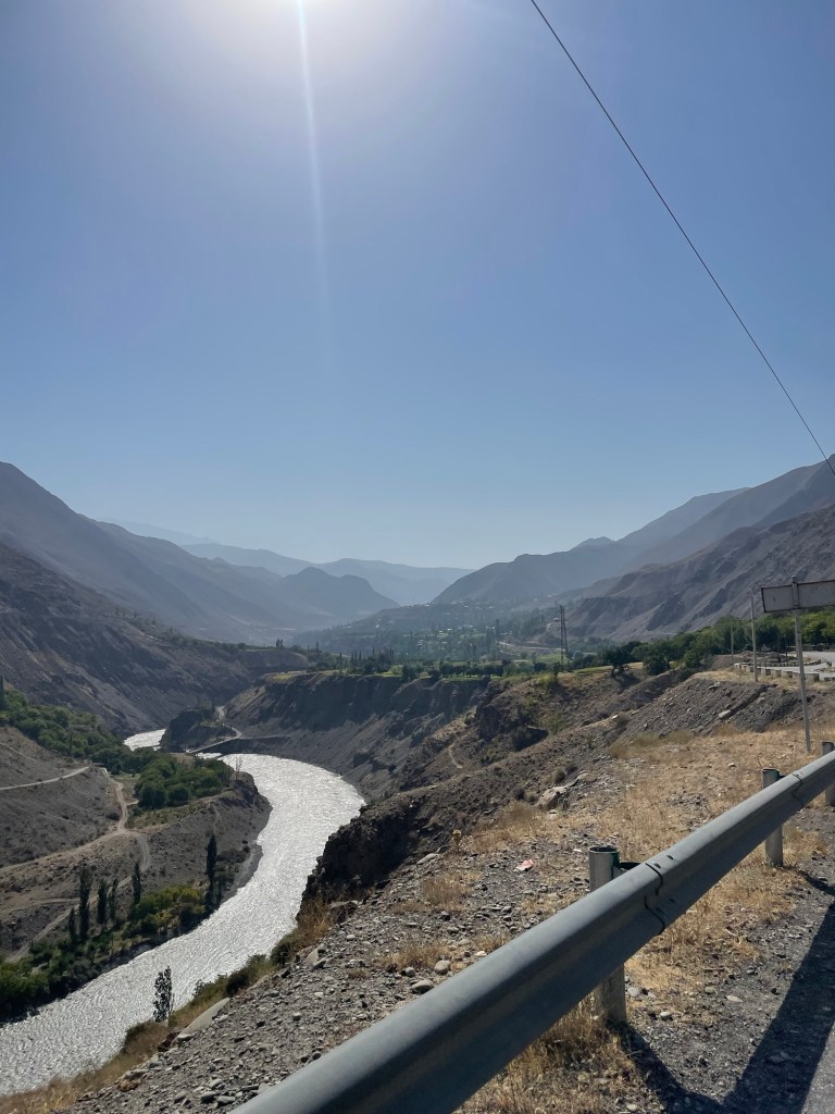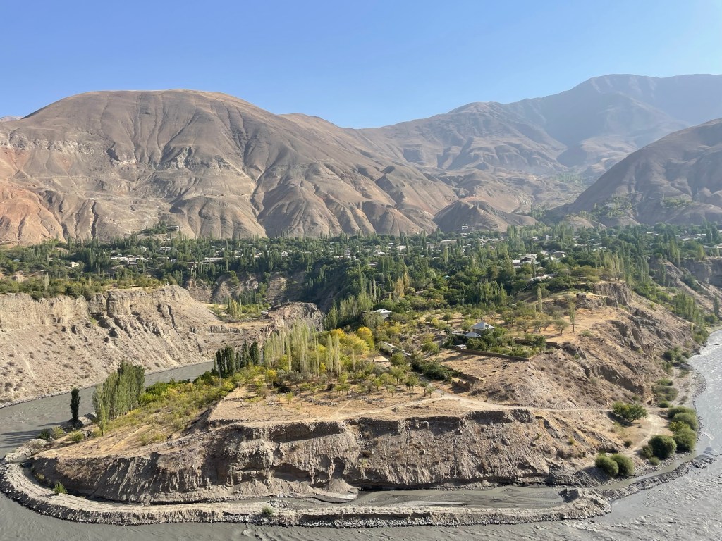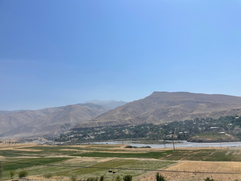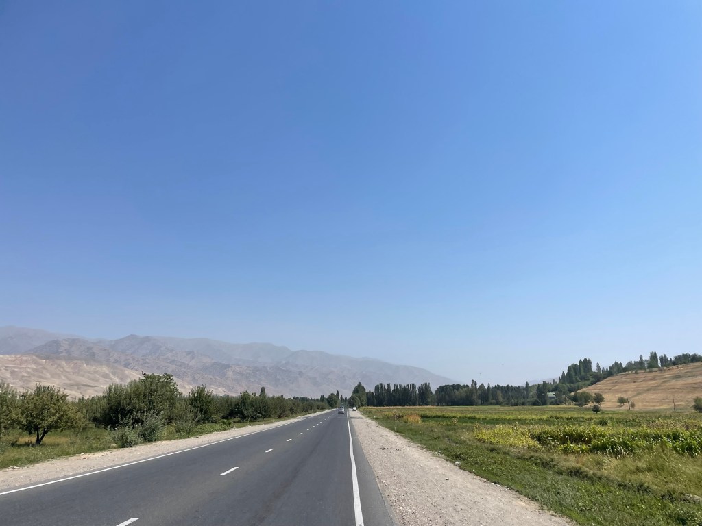 Het landschap verschilt erg van dat in Oezbekistan. Er is een grote verscheidenheid aan gewassen, waarvan vele klaarstaan voor de oogst, afgewisseld met boomgaarden, tussen bruine, kale bergen. Over straat wandelen Tadzjiekse dames in gewaden met kleurrijke patronen – opvallend vaak luipaardmotief – en steeds daaronder nog van hetzelfde laken een broek.