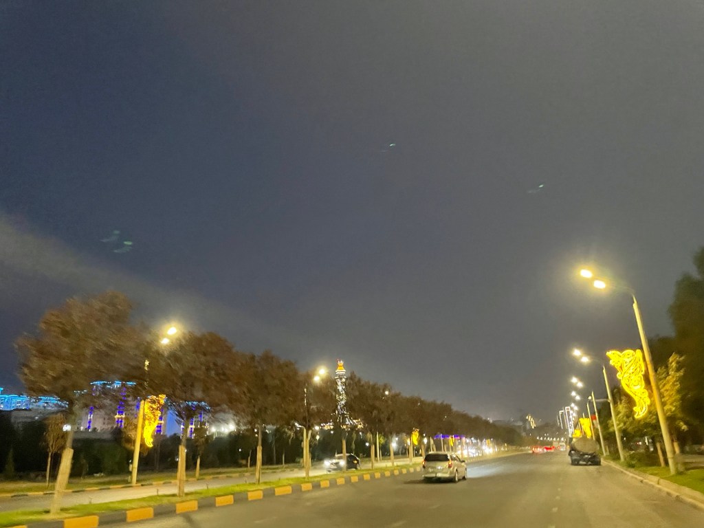 Over een onwaarschijnlijk kaarsrechte baan waarop niemand het rechterrijvak neemt, rij ik toe op de felverlichte stad. Het valt meteen op hoe protserig de gargantueske gebouwen zijn, sommige nog gelig uitgelicht voor extra praal. Als ik toekom in het populaire Green House Hostel, waar alle fietsreizigers samenkomen voor of net nadat ze de wereldberoemde Pamir Highway fietsen, merk ik pas hoe zwart mijn tronie is van de uitlaatgassen in die ene tunnel.