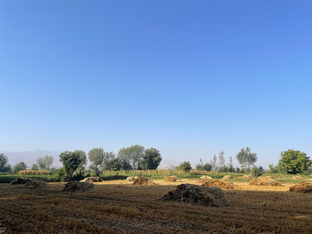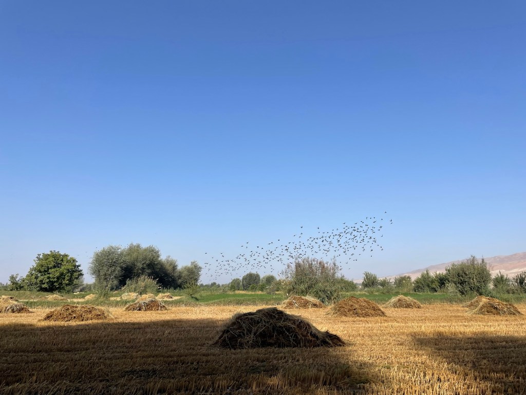 Het veld vol strostapels lijkt wel een roestplaats voor myna’s. De bruine vogeltjes met gele snavel en zwart-witte vleugelpennen fladderen en fluiten, spelen en bekvechten en scharrelen rond de balen. Het lijken er steeds meer te worden, totdat een grote kraai over de akker scheert en ze in één zwerm de vleugels nemen. De tent moet nu toch in de zon door alle dauw. De boeren hebben me al vroeg ontdekt, maar laten me met rust.