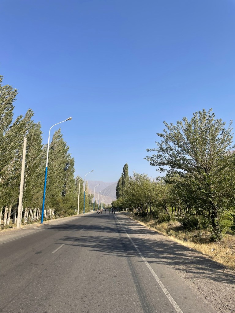 De mannen die langs de baan slenteren, dragen een laag zwart hoedje met witte borduursels of anders een tulband. De Chevy’s zijn foetsjie, opeens is Opel het enige automerk tussen alle elektrische driewielers. Na een uur passeert de teller voor schattige, enthousiaste kindjes die me hello toeroepen al de 100, en dat is geen overdrijving. Ik moet aan kinderen voortaan blijkbaar ook high-fives uitdelen. Volwassenen roepen me ‘Welcome, Tojikiston!’ toe. De Tadzjieken zijn al net zo verwelkomend als de rest.