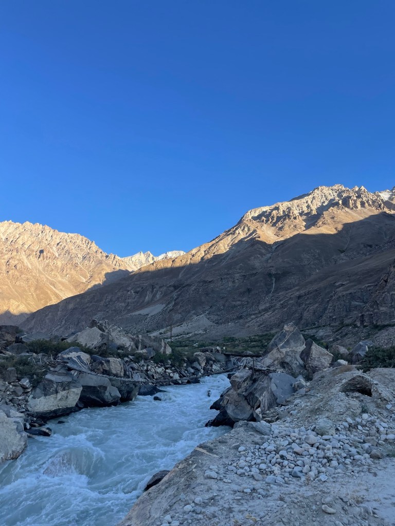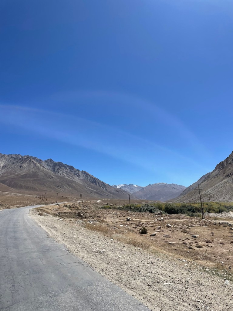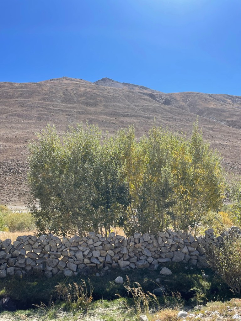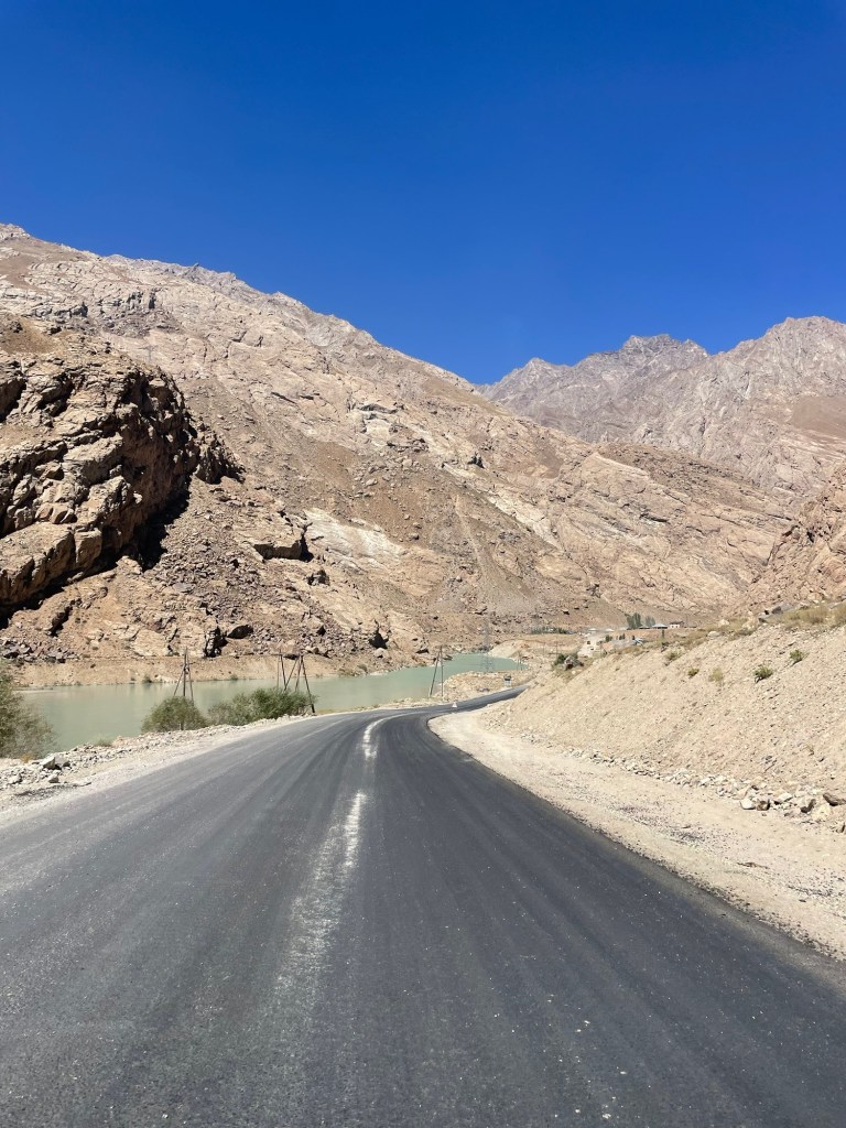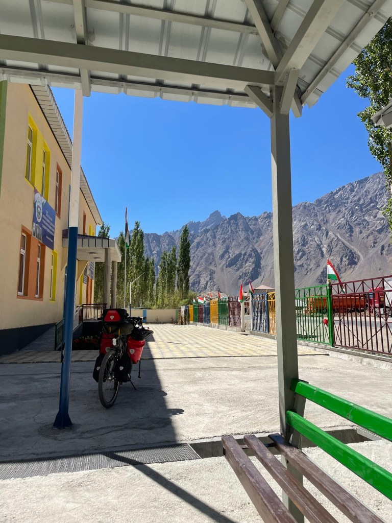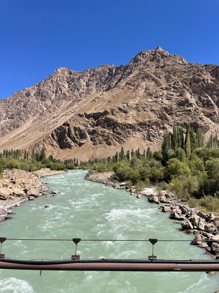 Het gaat meteen door een reeks kolonnades die schaduw bieden en zicht op de groenblauwe rivier tussen de bruine bergen. Na een afdalinkje worden nog maar eens mijn paspoort en toelatingsbewijs voor de GBAO gecheckt door een uiterst vriendelijke ambtenaar. In de dorpen klinken wederom alom de hello’s en hawajoe’s, al komen uit de monden van stoere tienerjongens soms vreemde geluiden, zoals ‘modarfokyu’. Dat zal vast iets Pamirees zijn.