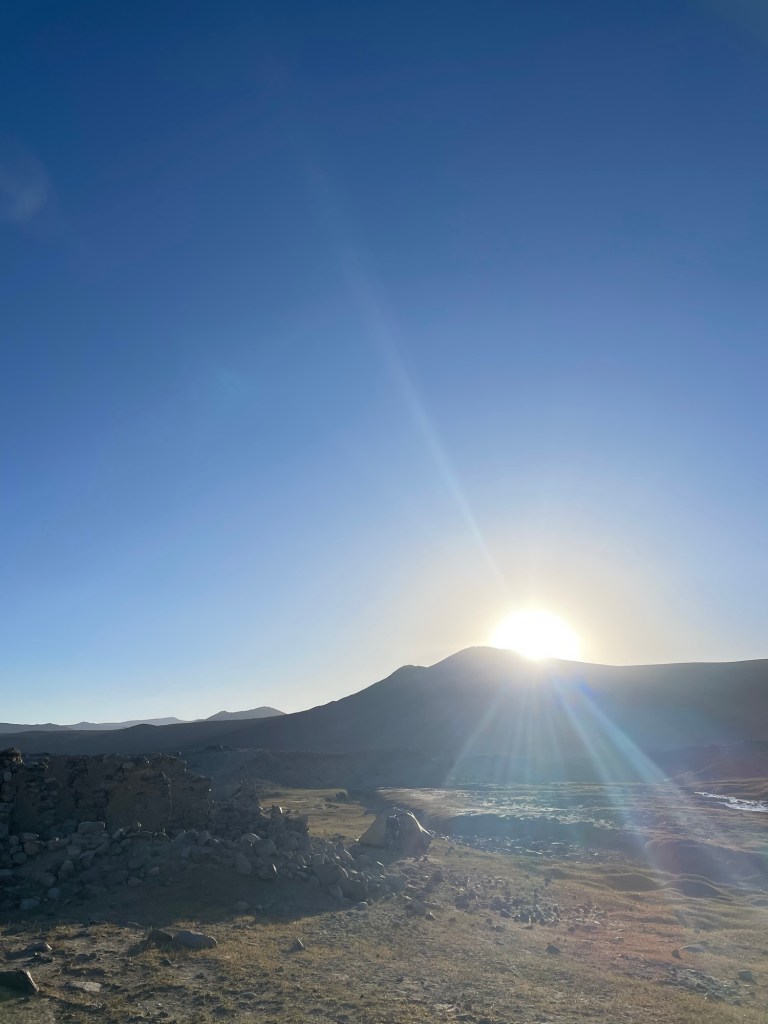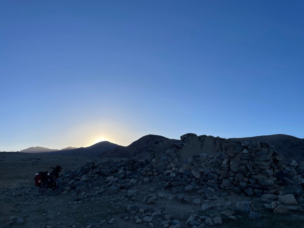 Net voor 18 uur kom ik toe bij een feeërieke plek achter een ruïne. De zon is bijna verdwenen dus de aankomsttactiek moet worden omgegooid. Eerst duik ik het stromende smeltwater in en dan gaat de tent recht. Het is mogelijk de koudste wasbeurt die ik ooit heb meegemaakt. Tussen de murenresten maak ik, zo goed mogelijk uit de wind, traditioneel Pamirees fietsersvoer: instant noodles, op smaak gebracht met rivierwater en hopelijk niet te veel geitenkak. Ik voel de neiging om mijn tenen mee in de warme pot te soppen.