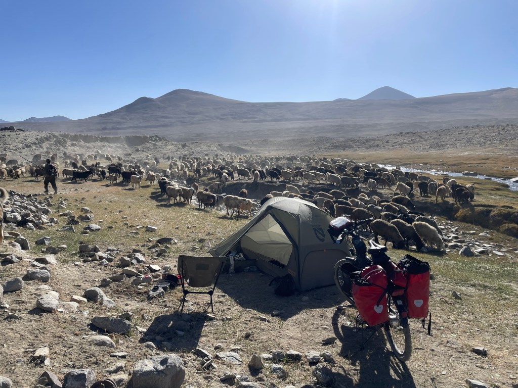Als ik met mijn kop in de tent wat oprommel, klinken er plots nieuwe geluiden. Drie honden stuiteren en snuffelen rond mijn tent en een springt er zelfs bovenop. Er komt een grote kudde geiten en schapen aangedromd. De herder en ik leiden de beesten rond de tent door stenen naast ze te mikken en enkele minuten later zijn ze alweer verdwenen uit het zicht. Nu is water van de rivier drinken niet verstandig meer, aangezien ze hogerop verzekerd permanent wordt volgekeuteld.