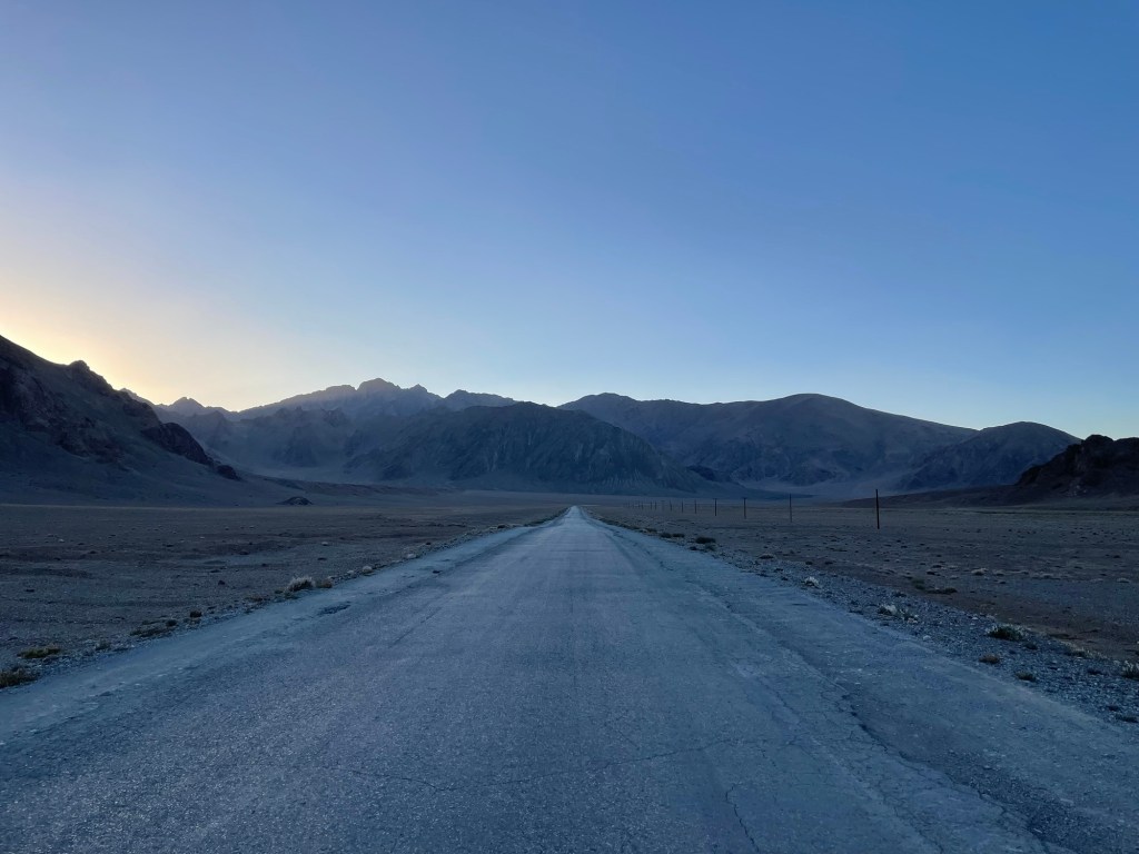 De tijd dringt. Het koelt af en de zon zakt weg achter de allerhoogste pieken. Net als het vooruit moet gaan, merk ik een platte achterband op. Geen tijd, oppompen en door. Ik trek twee paar handschoenen aan en rij door een onaards landschap te midden de gelige vegetatie van een stroompjesgebied. Soms houdt een stuk asfalt abrupt op in grote keien. Zo gaat het de hele tijd van 30 naar 5 per uur en weer terug.