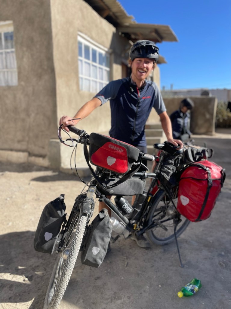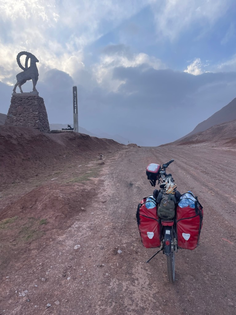 In een lichte paniektoestand moet ik kleren bij aantrekken en tegelijkertijd verhinderen dat alles wegvliegt. Snel een krachtreep en water binnen en op naar de volgende grote klim. Fietsend drinken lukt amper of ik word de kant in geblazen. Na twee uur sterven zie ik een gebouw in de verte aan voor de grensovergang, maar het blijkt een legerbasis. Een pekzwarte hond volgt me, leidt de weg zelfs en voelt aan als een engelbewaarder. Dit gaat me lukken.