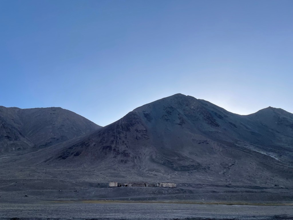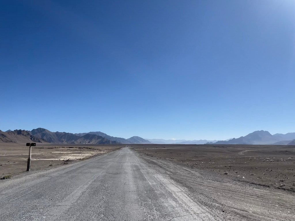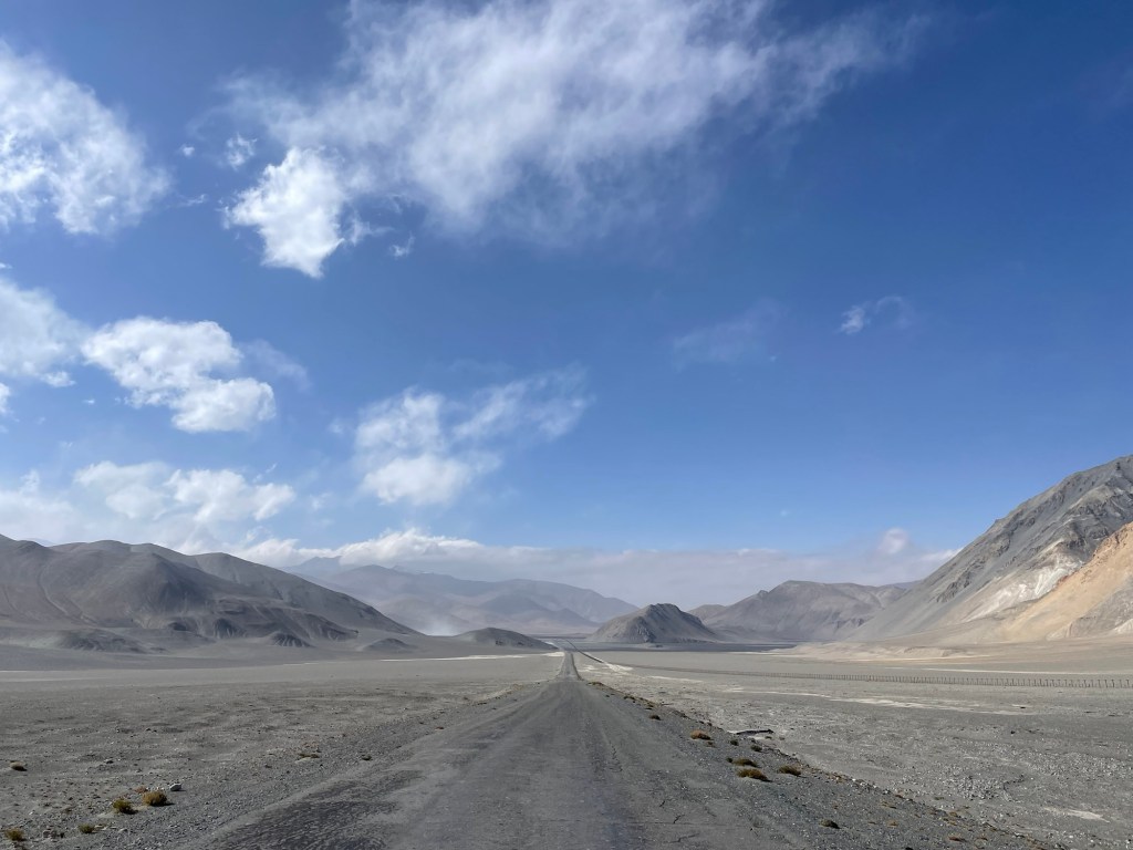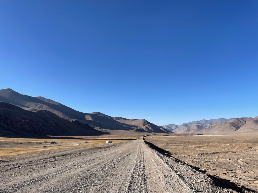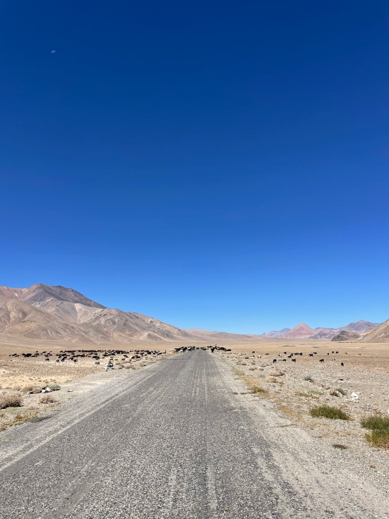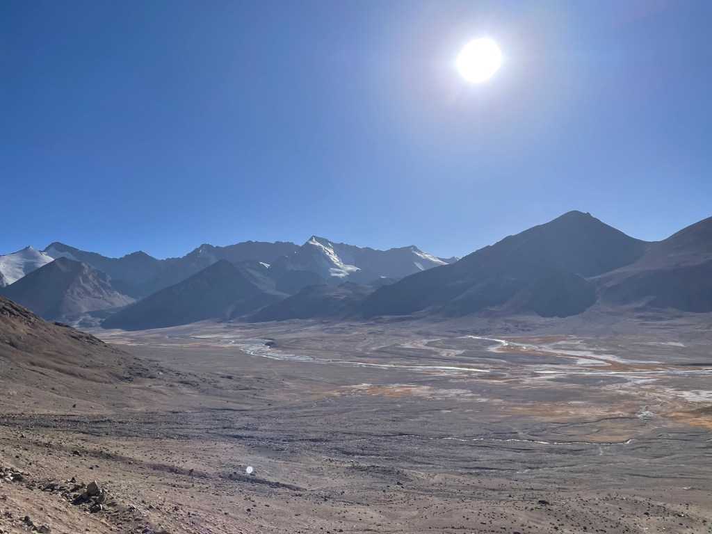 Hoewel de zon al hoog aan de hemel staat, is het nog fris. Vanaf Murghab gaat het over een plateau omgord door bruine vierduizenders waarvan er slechts één in de verte wit is met een bolle top. Misschien is dat dan een vijfduizender. Naast een markante rustplaats is het windstil en daarmee muisstil. Mijn oren tuiten, allicht door de hoogte, hoor ik nu pas.
