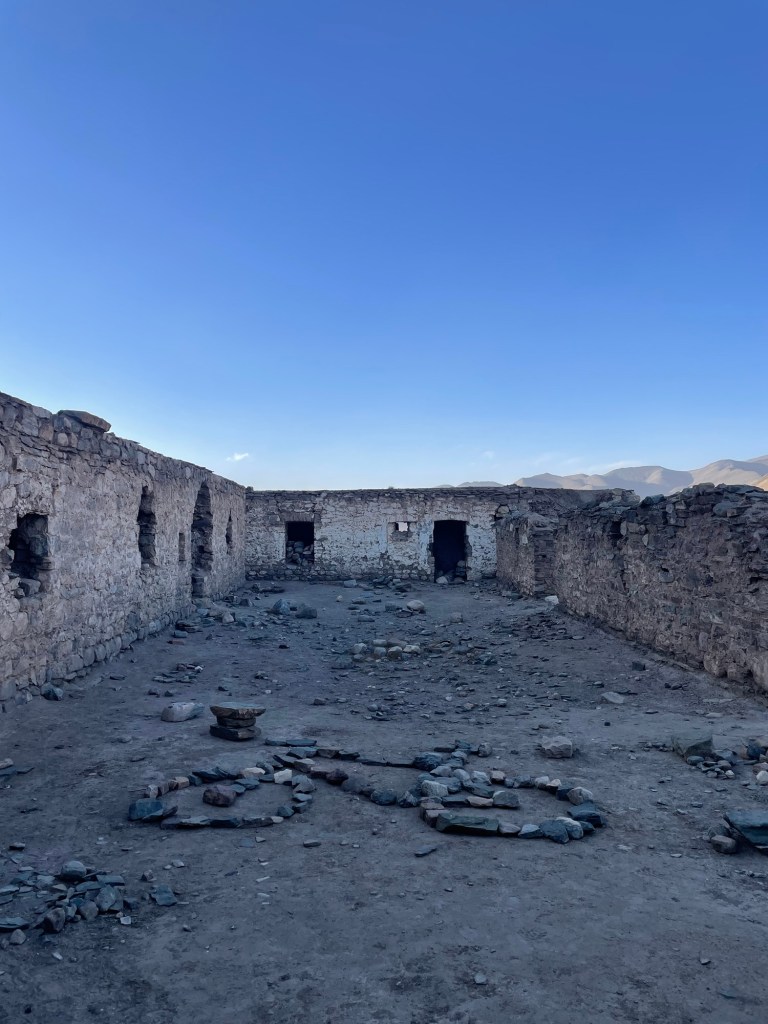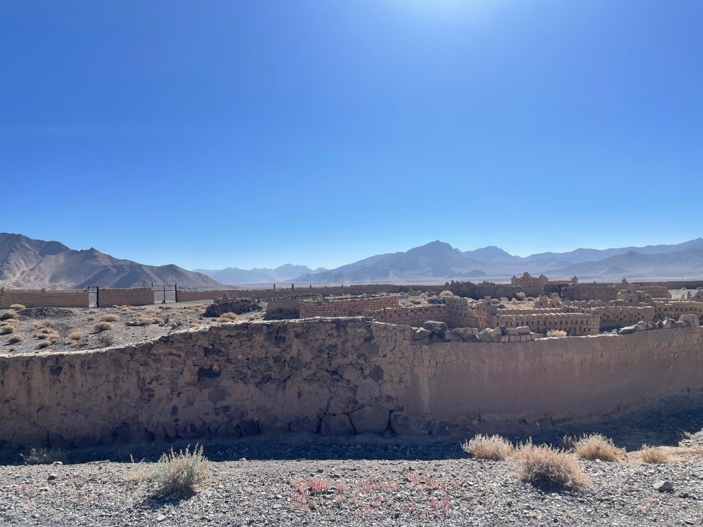Iets na vijven passeer ik een enorme vlakte en een ruïne van een karavanserai, een oude stopplaats voor handelaren, ontstaan op de zijderoute. Dat bergmeer ga ik toch niet meer halen dus ik kijk binnen de oude muren of er een tent past. Natuurlijk kamperen er al twee fietsers, elk in hun eigen luxekamer. Mike en Mina, die ik afzonderlijk al leerde kennen in Murghab, zoeken hier vanavond samen beschutting tegen de wind en ik mag bij in het gezellige onderonsje. De ruïne telt meerdere kamers en we grappen over hoe het misschien wel het beste hotel is in de hele Pamir. We koken elk ons voorziene avondmaal en delen reisverhalen. Een plezante, spontane afsluiter van een formidabele dag.
