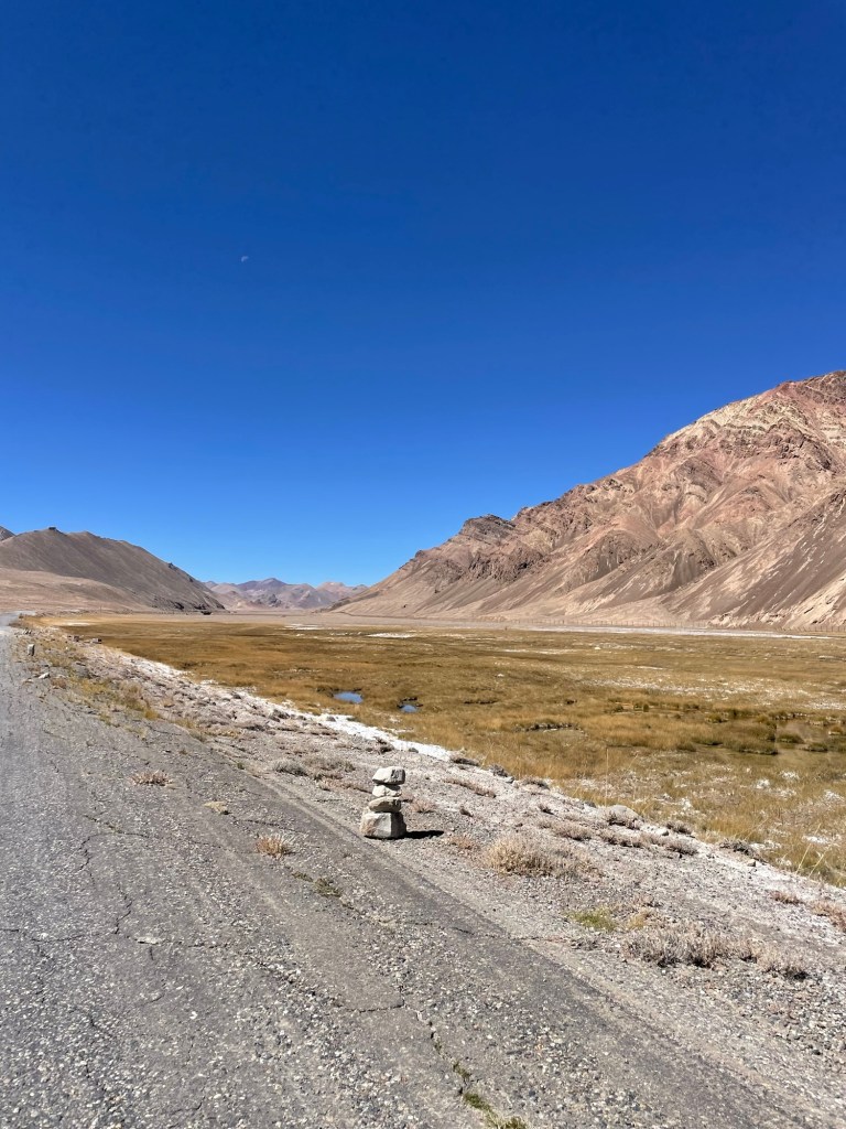 Langs de weg staan her en der steenmannetjes ter begroeting, vermoedelijk betekenisvolle bouwsels door wegenwerkers of anders het werk van toeristen die het landschap nog wat meer wilden romantiseren. Vanuit een inhalende jeep ontmoet ik Francesco en Sonja, een Italiaans koppel dat gisteren mijn restaurantrekening betaalde in ruil voor mijn reisverhaal. Zo is de sympathie voor de gemotoriseerde toerist weer wat hersteld.