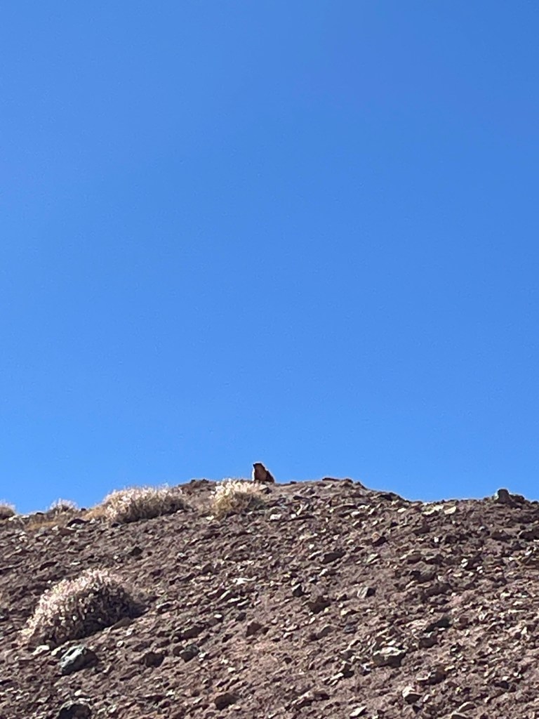 Nog geen kilometer na de schaft versnelt mijn ademhaling merkbaar. De top is niet ver meer. Over de weg waggelt haastig een logge marmot. Een paartje kruipt naar de top van een heuvel om de omgeving af te speuren. Als ik te dicht ben genaderd, in mijn poging een scherpe foto te nemen, krijst een van hen in een gek stemmetje dat er gevaar dreigt. Ik laat de potsierlijke roskoppen maar in hun habitat met rust.
