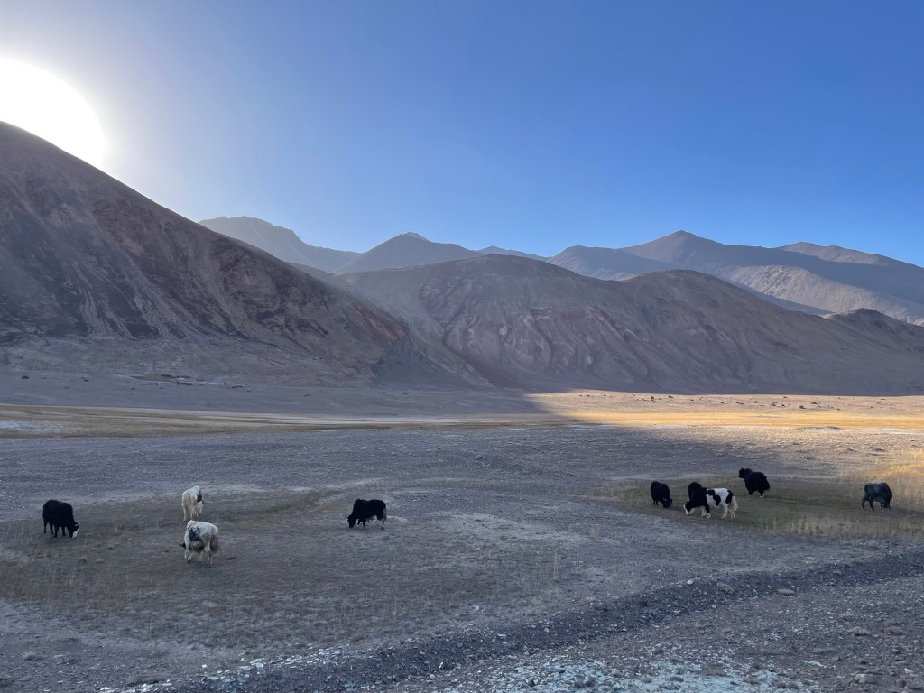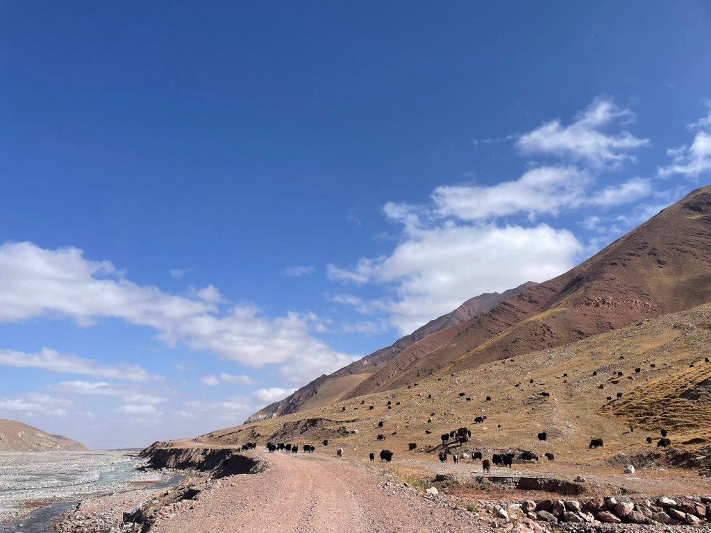 Terwijl ik een merkwaardig platte baan volg tussen de hoge toppen, verschijnt op links een zeldzame groene pelouse en daarop een kudde zwarte jaks. De Tadzjieken zijn trots op dat langharige rund, hun nationale flutbier is er zelfs naar vernoemd. Elk van de bultenaars staat schijnbaar stokstijf en graast op een afstand van de andere. Rechts stroomt verrassend rustig een rivier in strengen. De setting is fabelachtig en rustgevend, te meer omdat ik vandaag meer ruimte voel om er op het gemak van te genieten.