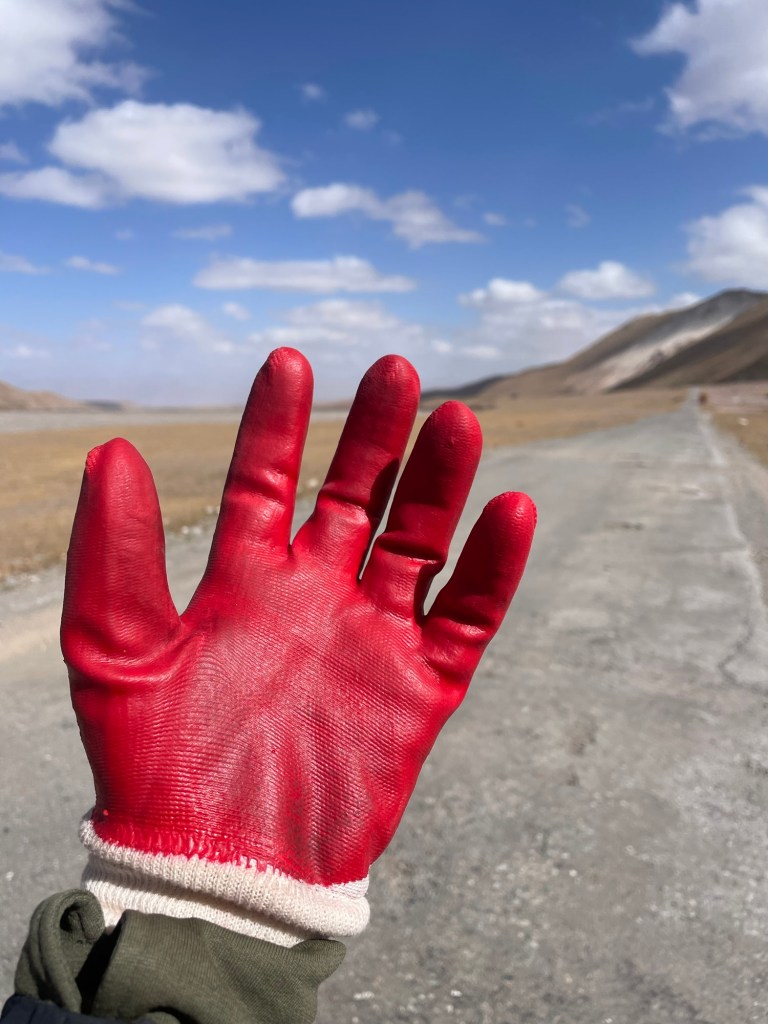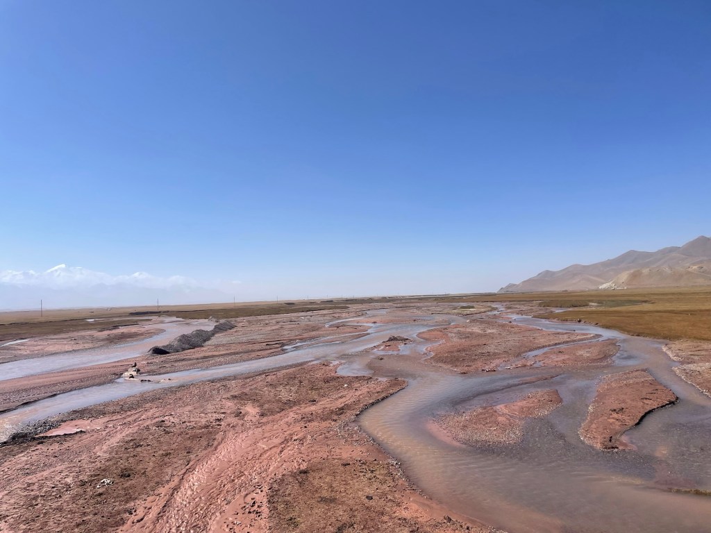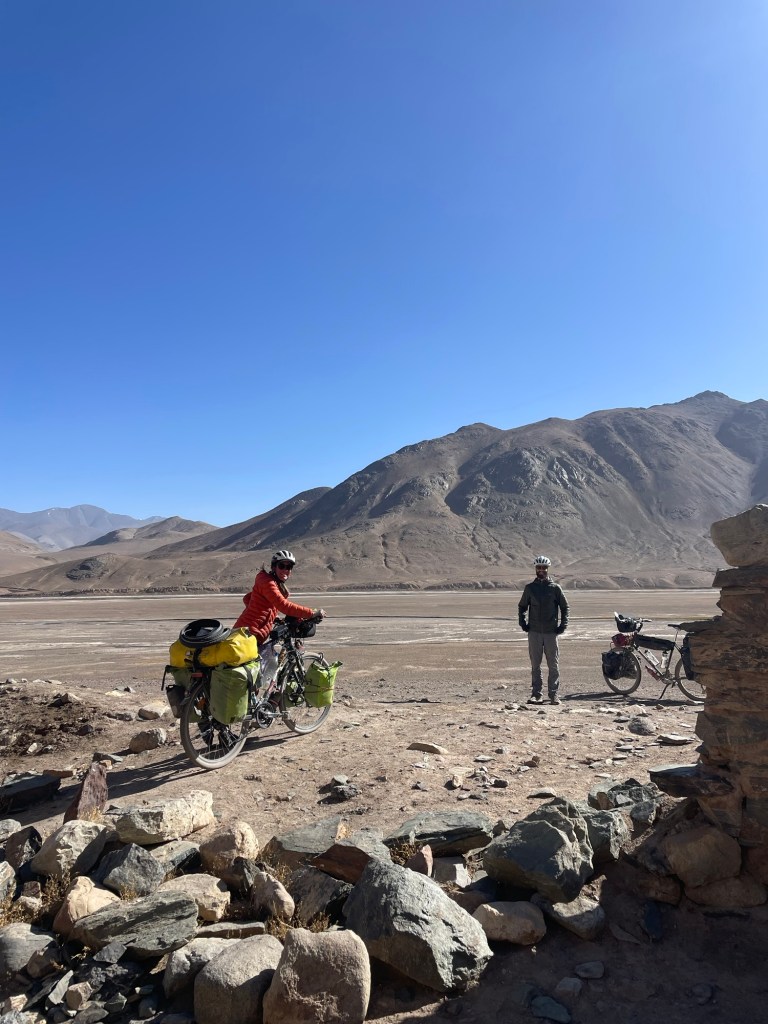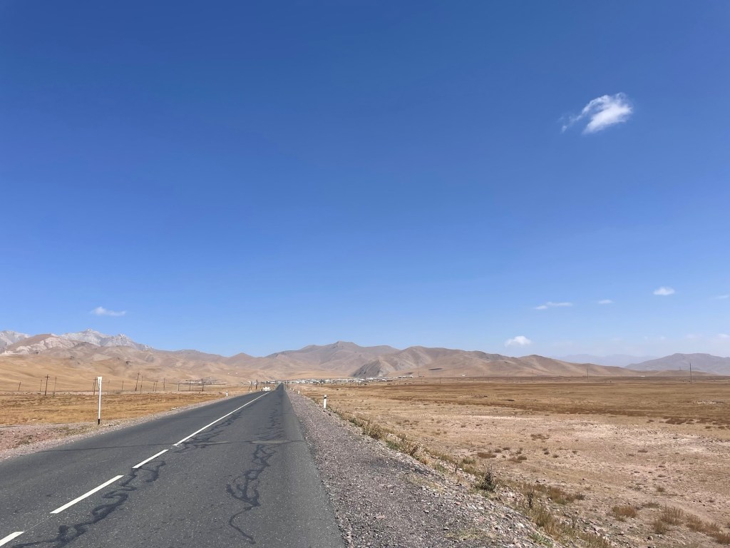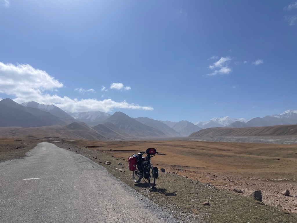 De nieuwe Kirgizische bergen zijn plots rood, de rivieren bevroren. Hoewel de zon schijnt, is het koud. Er verschijnt weer asfalt en de bergen verkleuren naar geel en goud. Eenzaam rijd ik langs een uitgestrekte rivierbedding in de kille ochtendlucht. Het is de mooiste alpiene skyline die ik ooit heb bewonderd en het idee dat ik tot hier met de fiets ben gekomen, voelt onwerkelijk.
