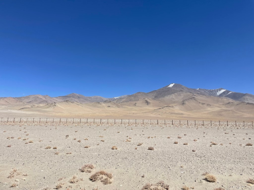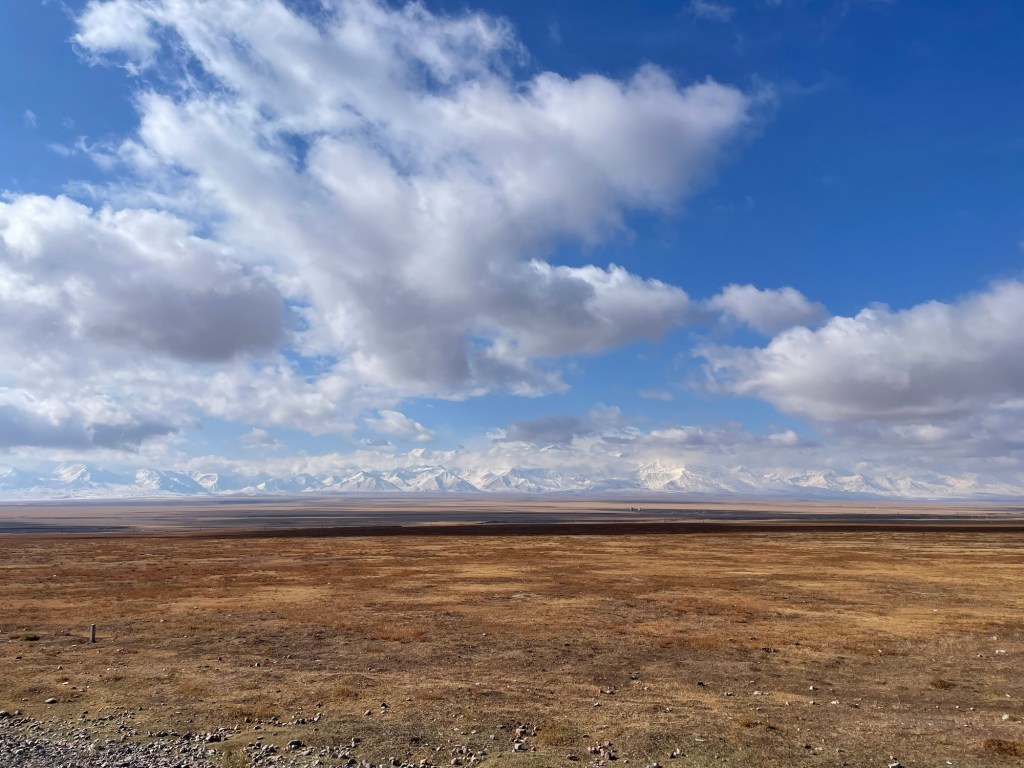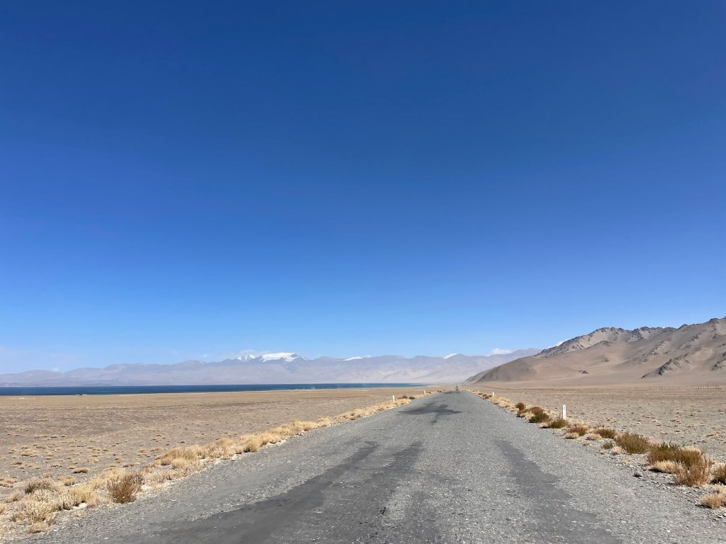 Doorheen het Pamirgebergte lagen er verbazend weinig besneeuwde toppen maar hier verheffen ze zich majestueus achter het kobaltblauwe Karakulmeer. Het contrast met de oranjebruine en witte grasvlakte ervoor maakt een onvoorstelbaar landschap. Op rechts loopt nog steeds het hek voor het niemandsland tussen Tadzjikistan en China.