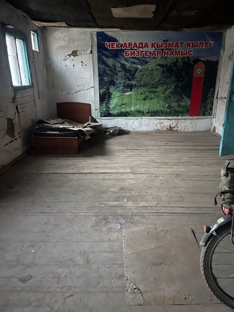 Als ik 5 km na de eerste controle een gebouw met Kirgizische vlag zie, vermoed ik dat het eindelijk de tweede controlepost is. Het blijkt een militaire basis van grenswachters. De aanvoerder komt enthousiast en merkbaar aangeschoten naar buiten en nodigt me uit om bij hen de nacht door te brengen. Even twijfel ik, want ik wilde echt naar Sary-Tash, maar dan moet ik toegeven dat het de veiligste keuze is. Ik krijg een kille, kale kamer in een leegstand pand toegewezen maar dat is wel duizend keer beter dan buiten in de vriezende wind.