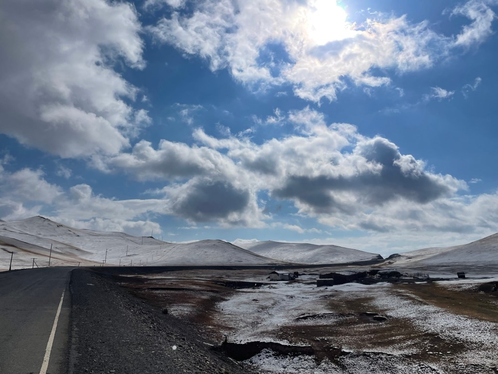 Het beeld van de baan die door een steeds besneeuwder landschap omhoog loopt, is verbluffend. Vanop een top kijkt een herder te paard uit over de heuvels als beschermer van zijn omvangrijke kudde geiten en schapen.