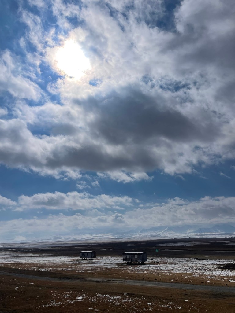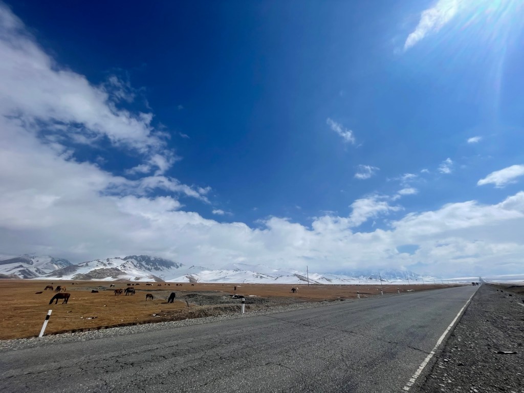 Van deze dag heb ik lang een beeld in mijn hoofd gehad, maar daarin kwamen nooit handschoenen, warme kledij en een sneeuwtapijt voor. Bij het buitenrijden van Sary-Tash is het zicht op de bergen irreëel. Ze steken nog duizenden meters hoger uit dan de vlakte en ogen vandaag plots wit en zwart. De tegenstelling met de geelgroene vlakte vol grazende zwarte spatjes heeft iets van een droomwereld.